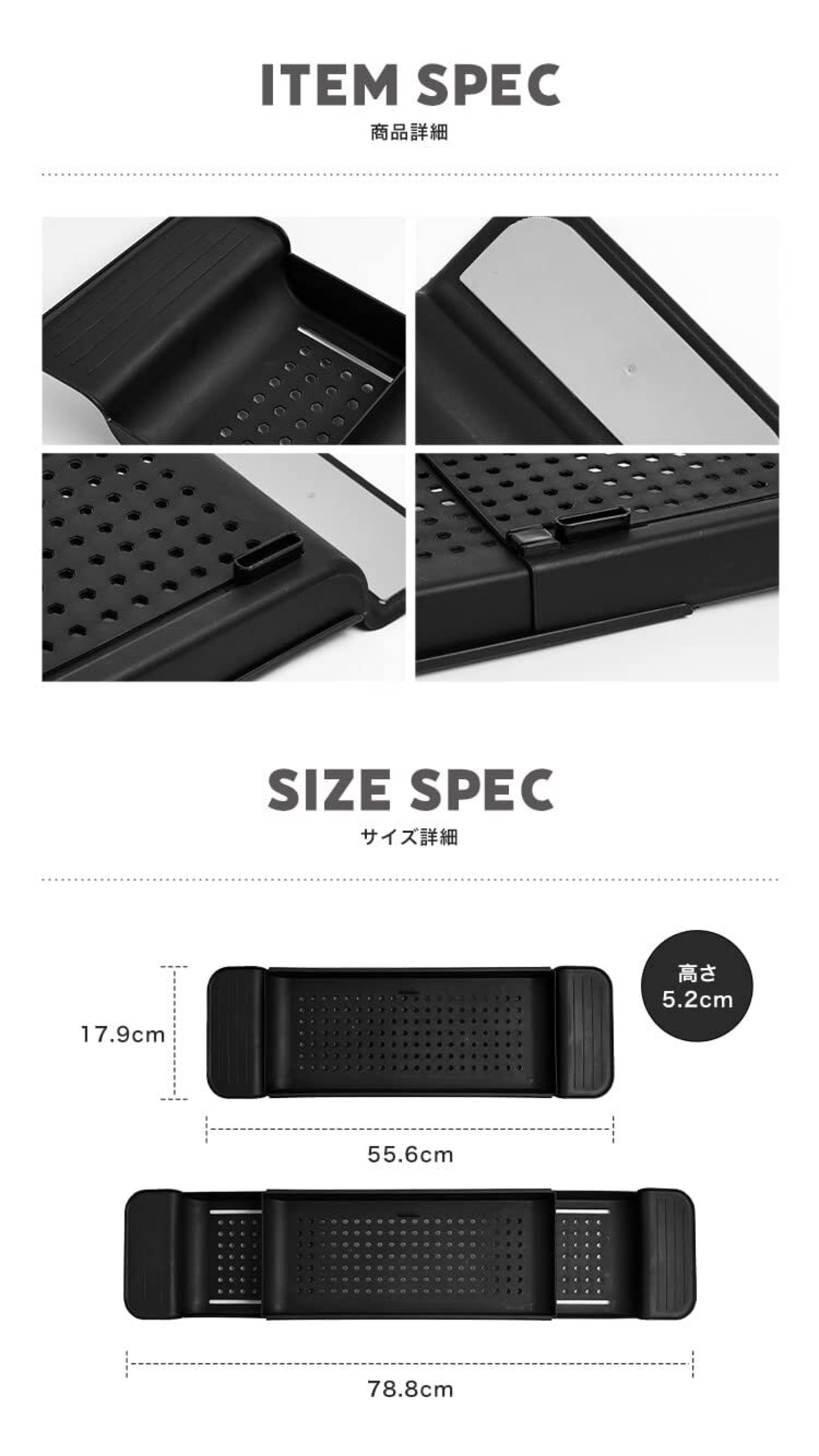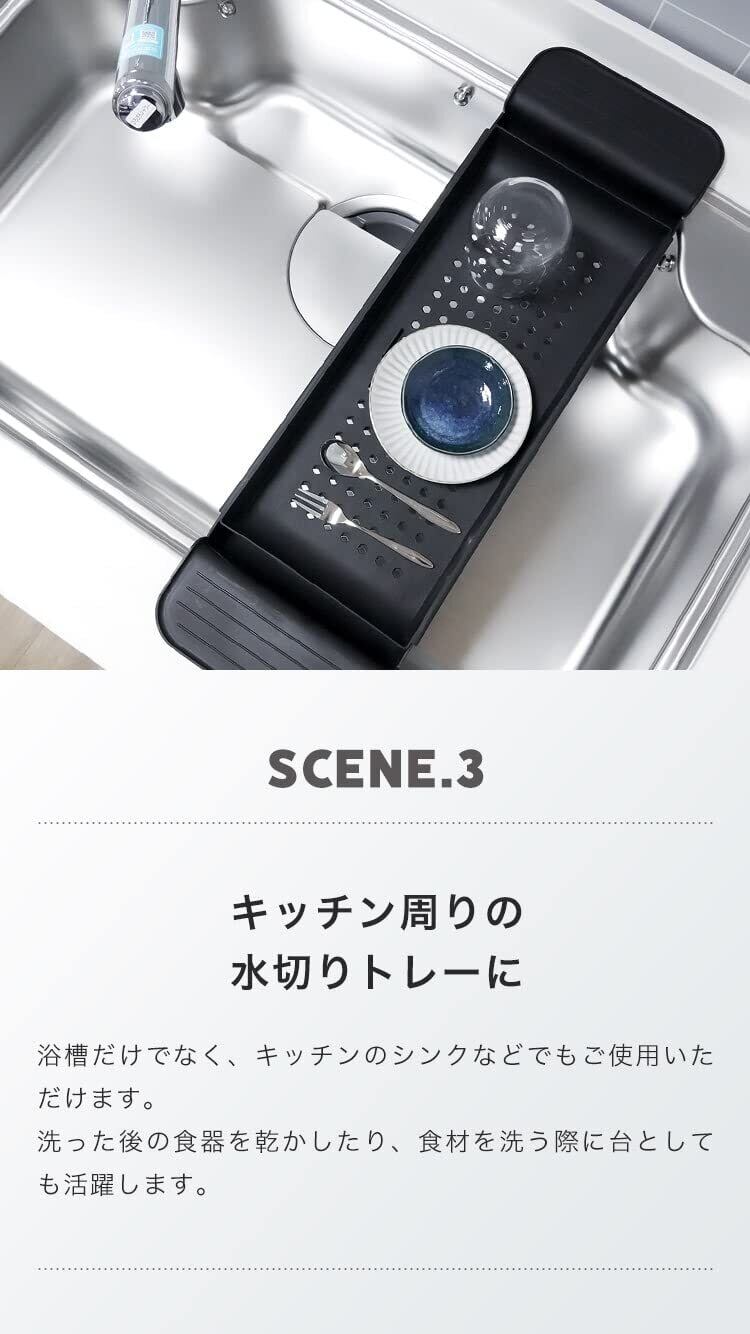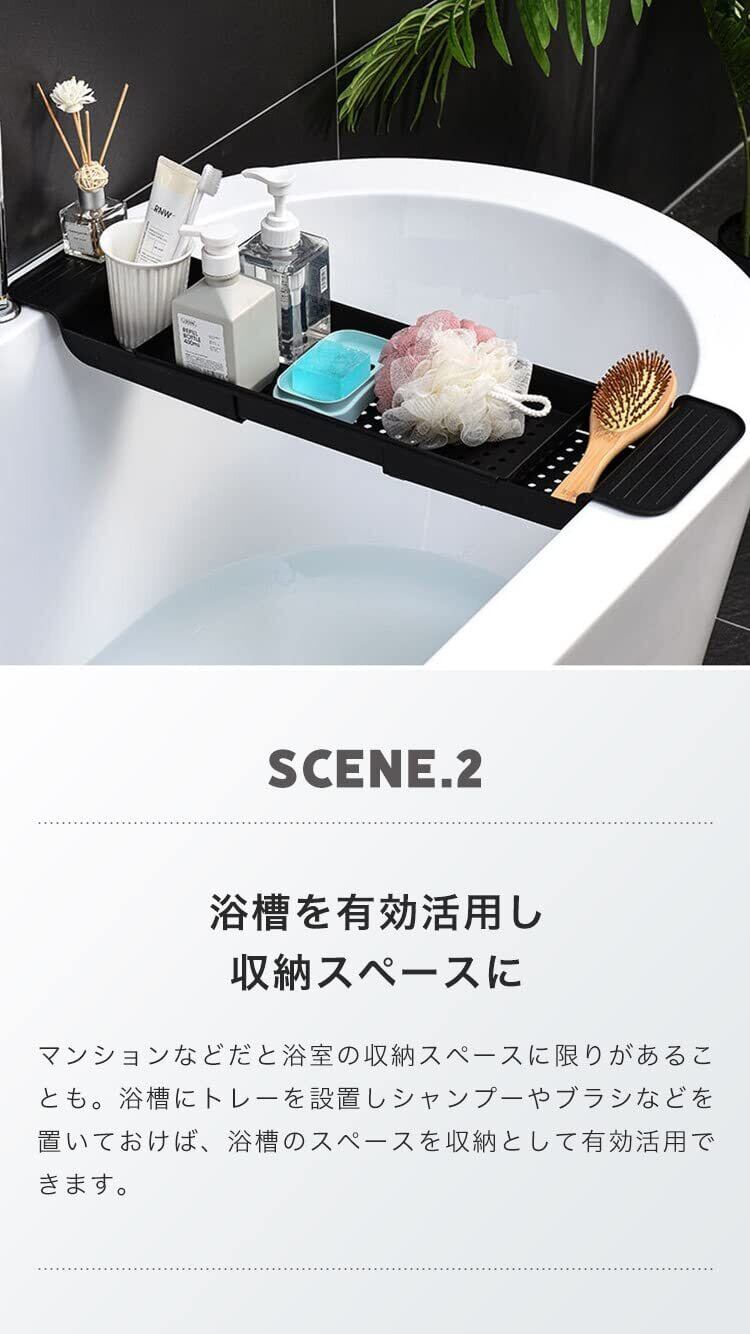 【伸縮式でサイズ調整可能】本体サイズは縦17.9×横(55.6~78.8)×高さ5.2cmとなり、サイドを引き伸ばすと最大78.8cmまで伸びるため、ご自宅のバスタブサイズに合わせて設置することができます。さらに、引き伸ばした部分は仕切りができるため、シャンプーボトルや掃除用具、タオルやアロマキャンドルなど、お客様の仕様用途に合わせた収納スペースとしてご活用いただけます。