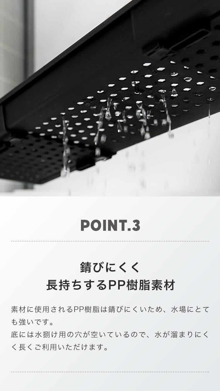 【素材と耐久性】本製品はPP樹脂素材でできており、水場に強く、錆やカビなどの発生を防ぐことができます。さらに本製品の耐荷重は4kgとなり、丈夫なつくりとなっているため、タブレットや飲み物を入れた容器、大き目のボトルなども載せることができます。