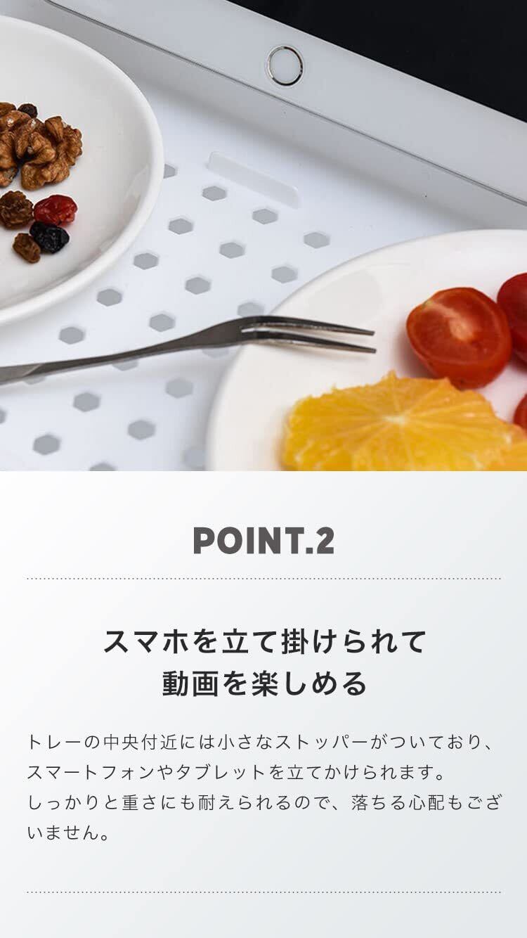 【スマホを立て掛けられる】トレーの中央付近には小さなストッパーがついており、スマートフォンやタブレットを立てかけられます。 しっかりと重さにも耐えられるので、トレーから落ちる心配もございません。