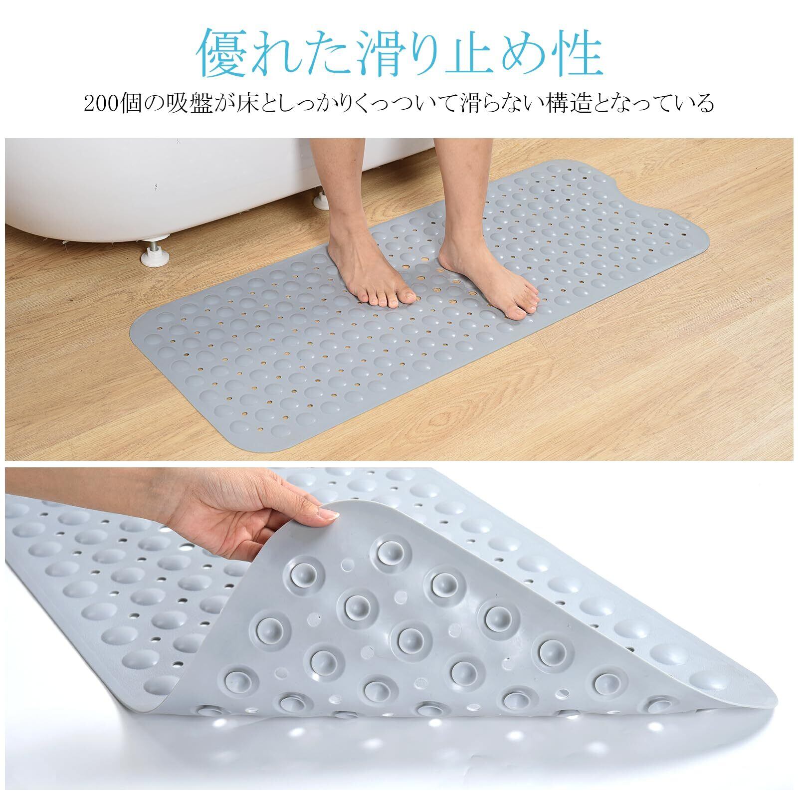 【滑り止めデザイン】お風呂マットの裏面に200個の吸盤で床としっかり吸着、滑りや転倒を防ぎます。表面が滑り防止のための凸凹加工が施してあり、乗っても滑りにくくなっています。使用注意点:1.裏面の吸盤部を少し水で濡らす。2.浴槽の底面に押しつけるように吸着させてください。