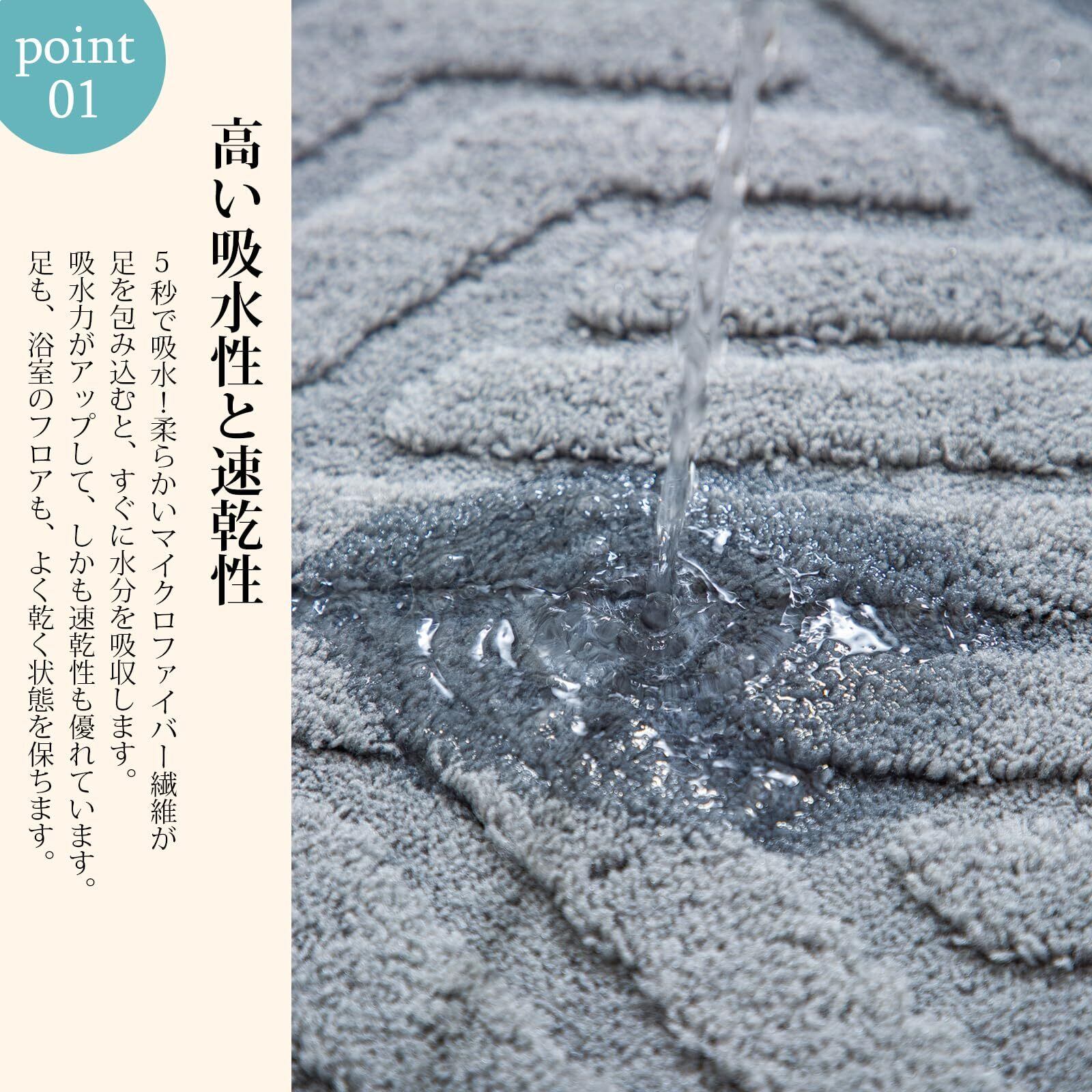 【瞬間吸水】お風呂上がりの水滴が触れた瞬間、その優れた吸水性に驚かされることでしょう。ファイバーの間には無数の空隙があり、瞬時に水を吸収し、あなたの足元をいつも快適に保ちます。