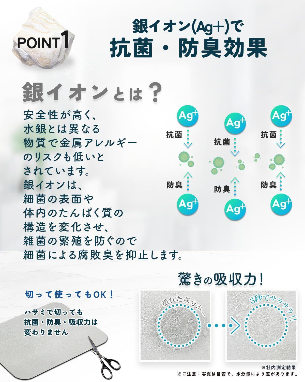 【銀イオン配合】抗菌・防臭の効果があります。細菌の表面や体内のたんぱく質の構造を変化させ、雑菌の繁殖を防ぐので細菌による腐食臭を抑止します。