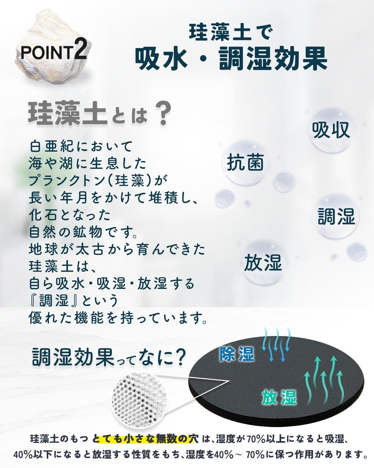 【珪藻土配合】吸水・吸湿・放湿する『調湿』という優れた機能を持っています。 珪藻土は、植物性プランクトンの化石を原料としており、無数の小さな穴があります。 これによって、高い吸水性と速乾性を兼ね備えています。