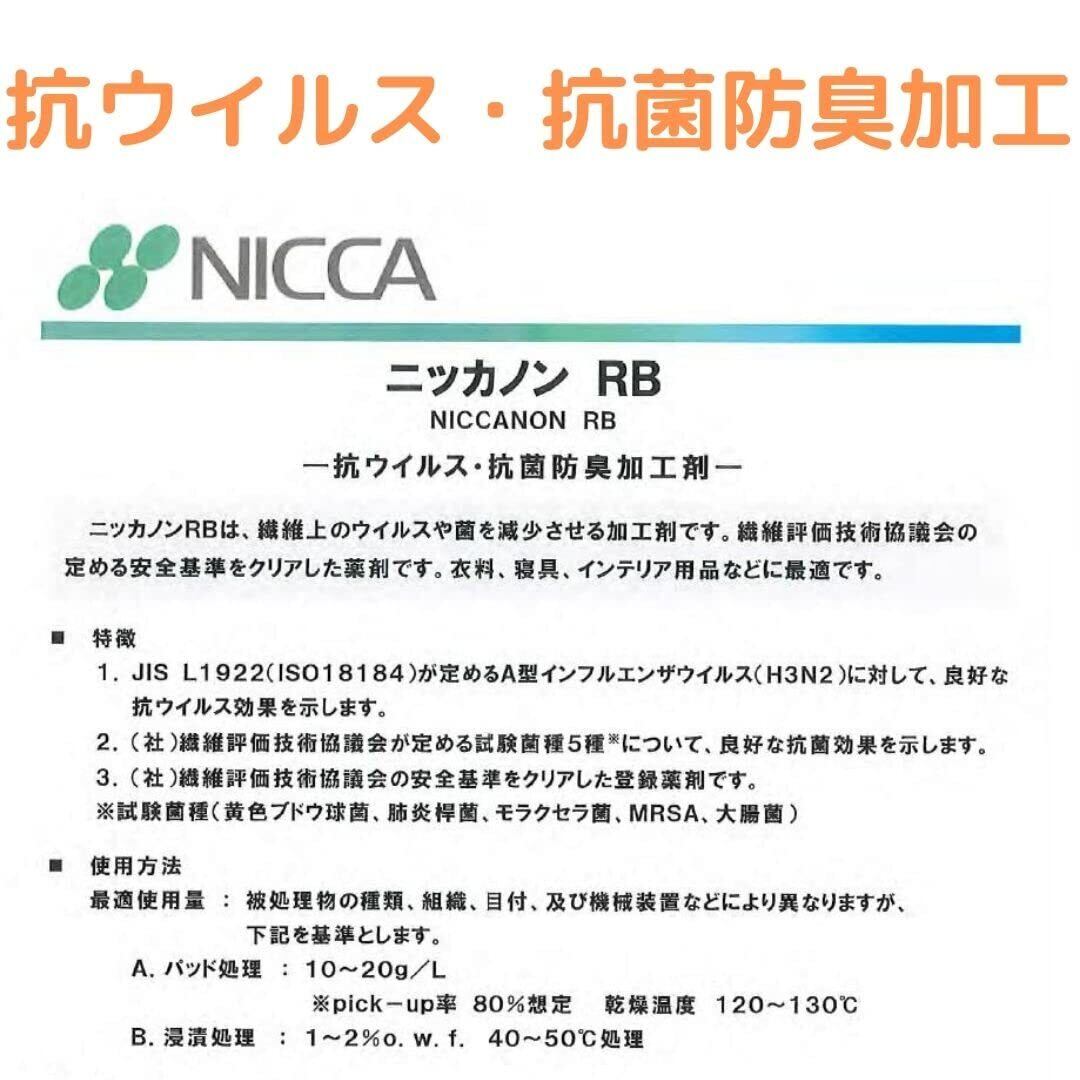 【抗ウイルス・防臭・防菌加工】抗ウイルス・抗菌防臭加工剤ニッカノンRBを使用しているので、使って安心です。洗濯して何度でもご利用頂けます。