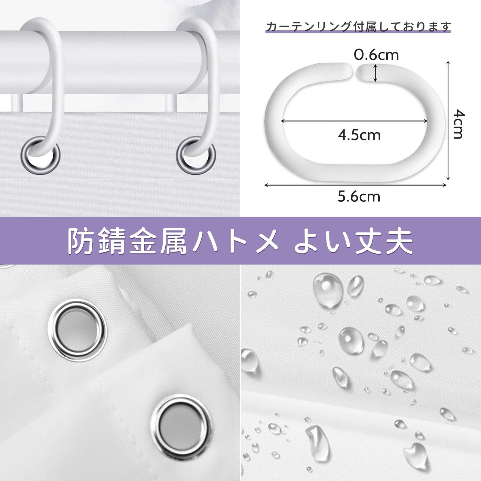 【シャワーカーテン】サイズ180 x 180cm。吊り下げ用のリングが12個付属しており、取り付けが簡単です。標準サイズのストレートおよびカーブしたシャワーロッドに適しています、よく固定できます