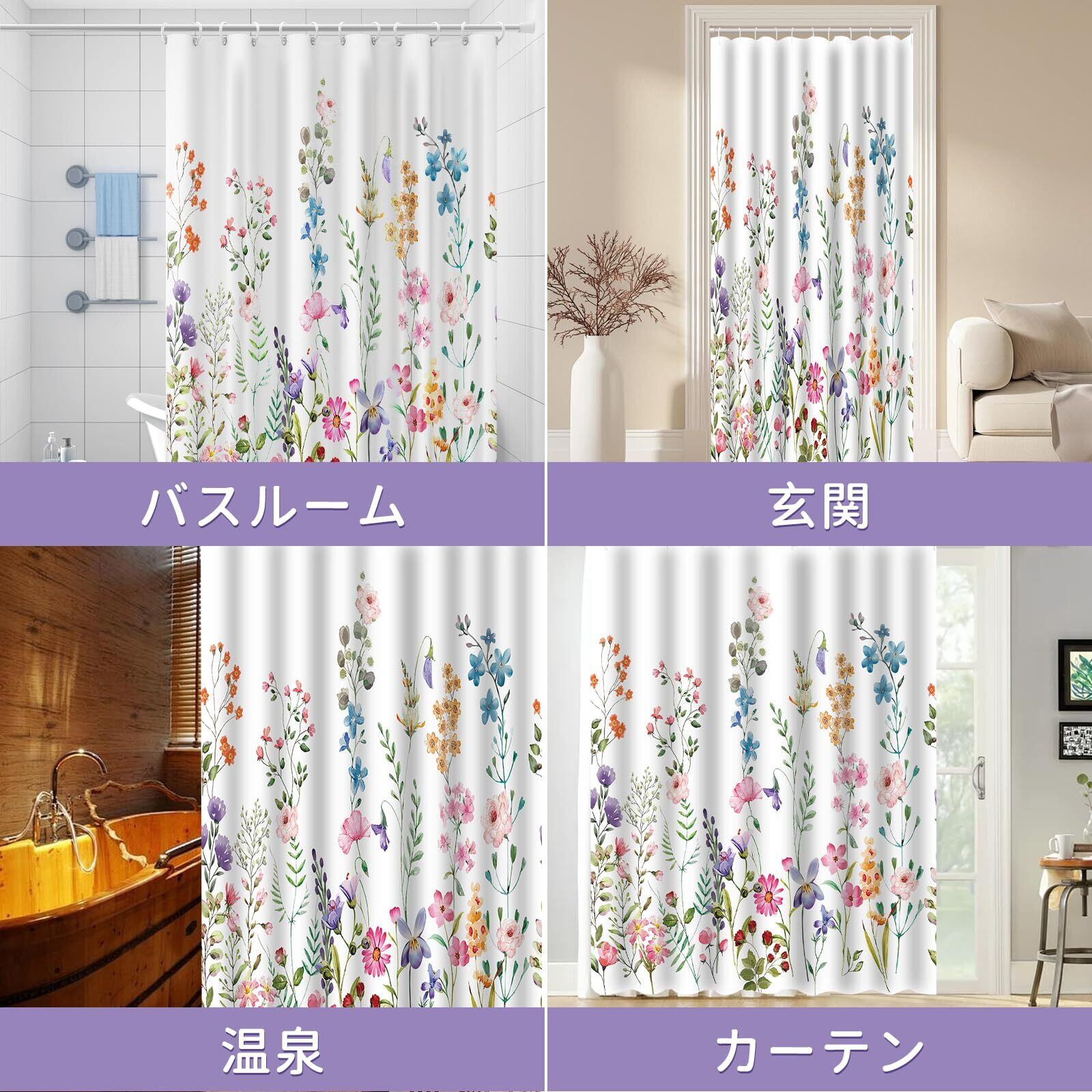 【花柄デザイン】このカーテンは、自然に近い花柄系プリントが施されており、バスルームを明るく自然に近い気があります。シャワーカーテンとしてだけでなく、部屋の仕切りや更衣室、棚の目隠しにもお使いいただけます