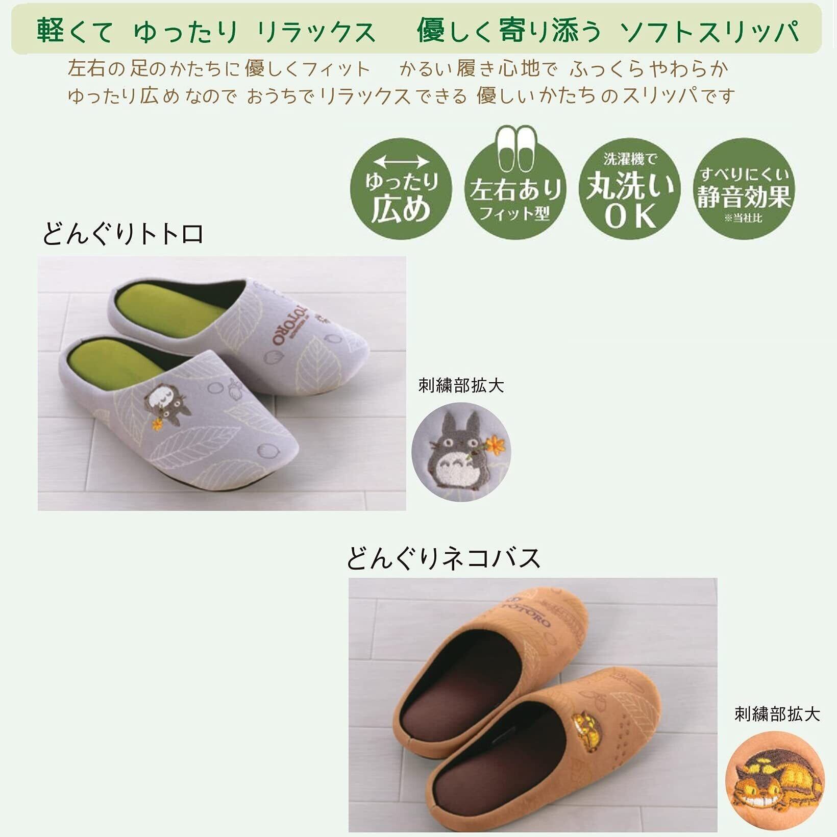 軽くて ゆったり感のある優しい履き心地のソフトスリッパ。トトロの世界観を感じるカラー生地にデザインプリント、右足側面にワンポイント刺繍入り。中板部分はワイドでゆったり広め、内部に低反発ウレタン入り。ウォッシャブル(タンブラー乾燥はできません)。