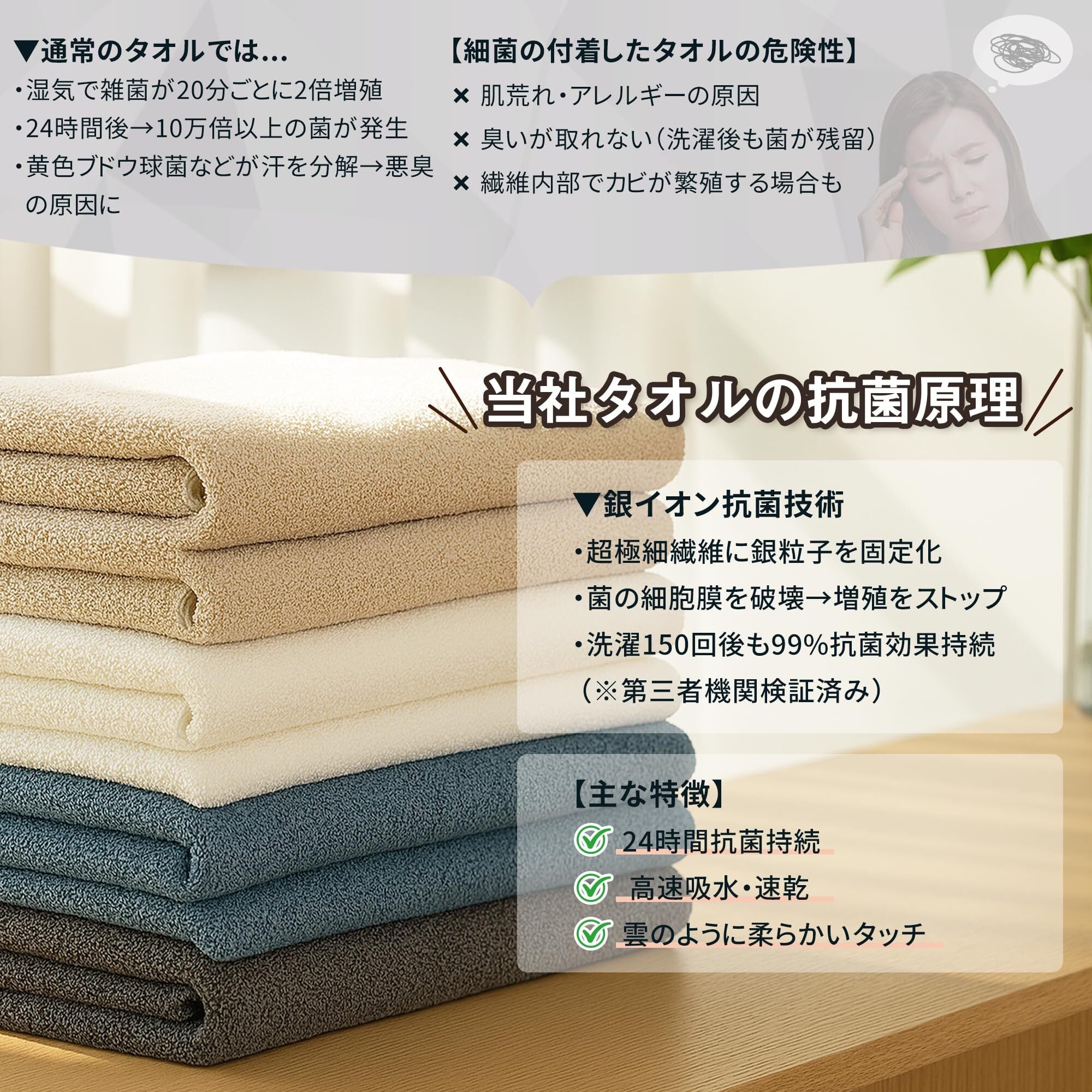 ▶【7A級銀イオン抗菌】抗菌率は99%以上で、黄色ブドウ球菌や大腸菌を効果的に抑制し、カビや臭いを防ぎます。 【第三者機関による厳格な検査を経た認証】150回洗濯後も抗菌効果が持続します。タオルの抗菌効果は長期間使用すると徐々に低下し、タオルは4〜6ヶ月ごとに交換することをお勧めします。