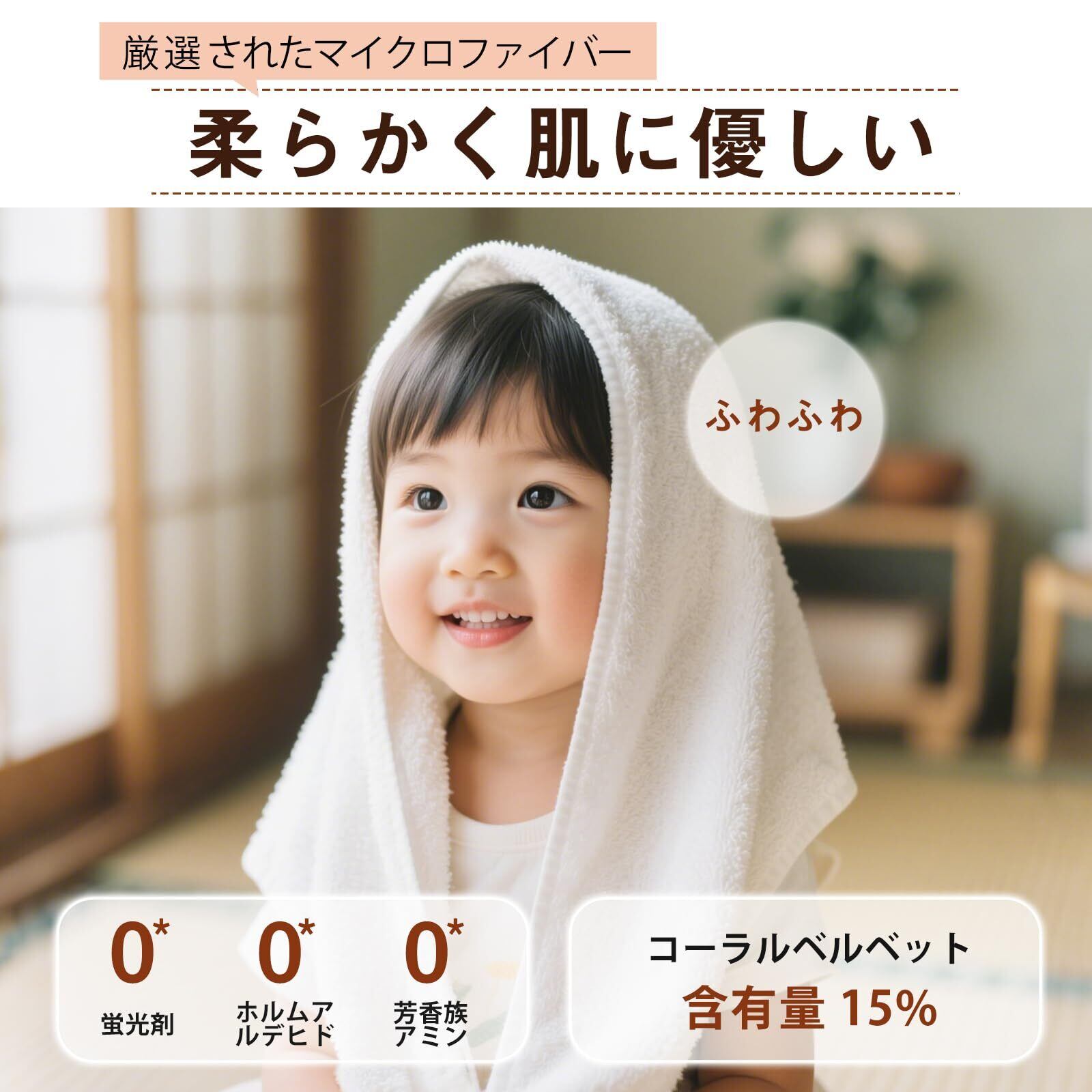 ▶【ふわふわ柔らかな肌触り】普通のタオルより細い高級繊維を使用しています。吸水性と速乾性を確保しながら快適性も考慮し、コーラルフリース素材をプラスしました。手触りが柔らかく、蛍光剤や香料などは一切使用しておりません。赤ちゃんや小さなお子様のデリケートな肌も優しく守ります。