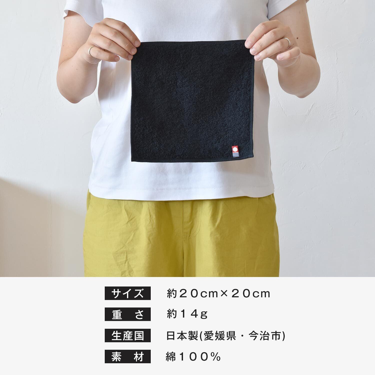 【商品詳細】サイズ:20×20cm 重さ:14g 素材:綿100% 原産国:日本(愛媛県・今治市) 今治認定番号:第2023-1126号