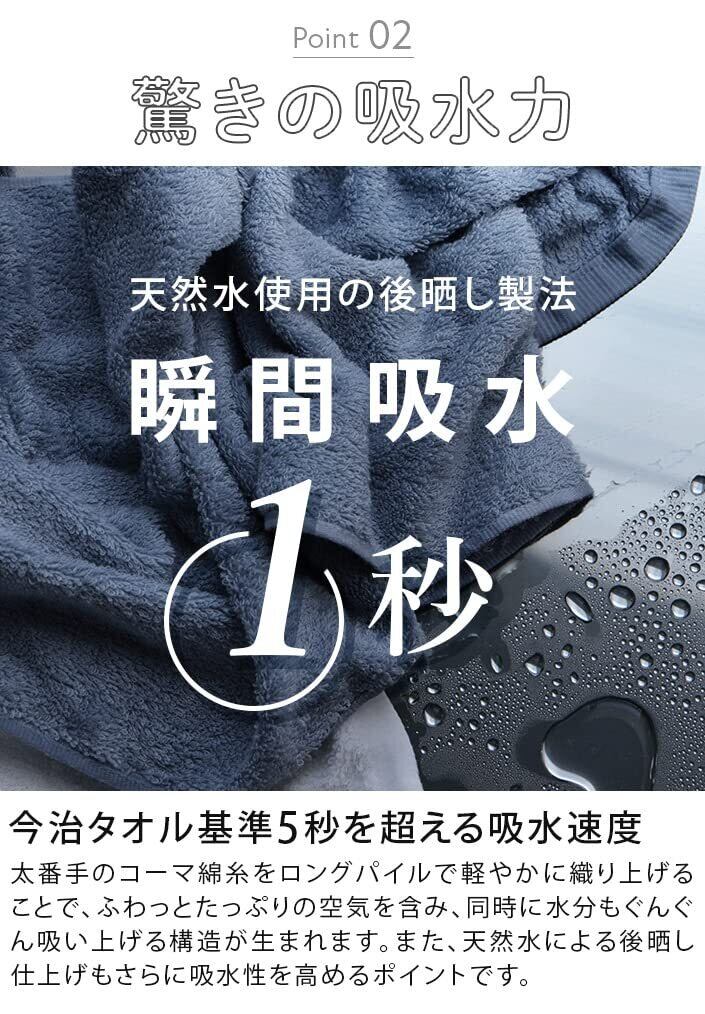 【抜群の吸水性】日本タオル検査協会で実施したタオル検査において、タオル片を水に落とした時の沈下の速さを計測したところ、今治タオルの5秒以内という認定基準をはるかに超え、約1秒で沈みました。抜群の吸水性が自慢のタオルです。