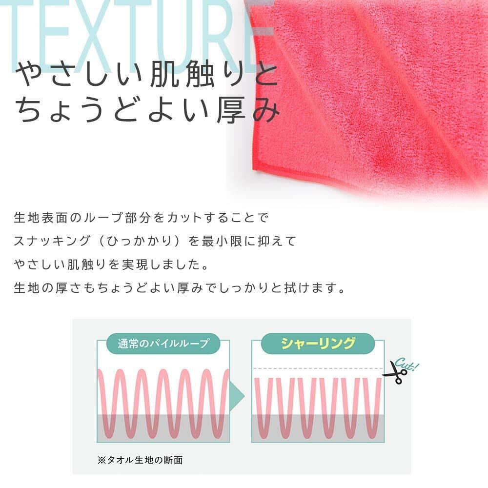 生地表面のループ部分をカットすることで、スナッキング(ひっかかり)を最小限に抑えてやさしい肌触りを実現しました。生地の厚さもちょうどよい厚みでしっかりと拭けます。