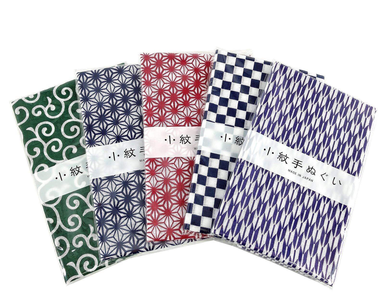 ●裏通しプリントされた小紋柄が5枚セットになった人気の日本製の手ぬぐいです。伝統的な柄から、かわいい柄まで豊富にご用意しております。