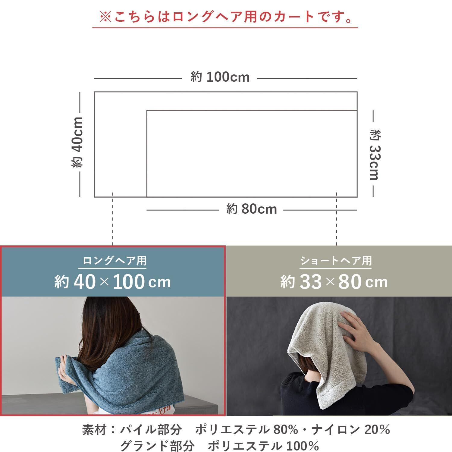 【風のないドライヤー ロングヘア用】※本商品はヘアドライタオルです※サイズ:約40×100cm、素材:パイル部分:ポリエステル80%・ナイロン20%、グランド部分:ポリエステル100%