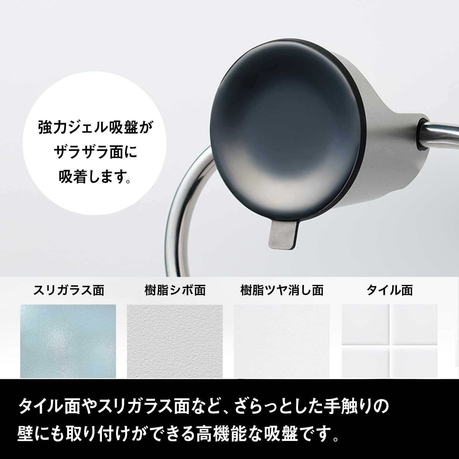 ザラザラ面やツヤ消し面にも強力に取り付けられる、特殊なジェル吸盤を採用。