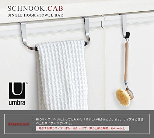 <シンク下や洗面下の収納扉用のタオルバー!> ◆簡単に設置:スックヌック キャブ タオルバーはシンクの下の扉に引っかけるだけで簡単に設置が可能 ◆機能的:タオルを掛ける部分にラバーが付いているのでタオルで手を拭いた後にタオルが滑り落ちにくい ◆保護:扉に引っかける部分の接地部分にはラバーが貼ってあり扉を傷つけない ◆対応扉サイズ:厚さ約20mm未満、上部の隙間約4mm以上 ◆デザイン:UMBRA DESIGN GROUP シンク回りや洗面所でタオル掛けが無くて困った事はありませんか? またタオルで手を拭いた後に、タオルが簡単に滑り落ちて掛けなおして面倒に思った事はありませんか? ■Umbraからスックヌック キャブ タオルバーの紹介■ Umbraのスックヌック キャブ タオルバーはそんな問題を解決します。 シンク下や洗面所下の収納扉に引っかけるだけで簡単にタオルが掛けられます。タオルを掛ける部分はラバーで覆われているのでそれが滑り止めになり、手を拭いた後に簡単にタオルが落ちてしまう事もありません。扉に引っかける部分の裏側には保護用のラバーを貼ってあるので、扉を傷つける事もありません。このUmbraのスックヌック キャブ タオルバーを使って、便利に簡単に必要な場所でストレス無くタオルが使える様にしてください。 Umbraについて:世界的なプロダクトデザイン会社で、オリジナル、モダン、カジュアル、機能的で手ごろな価格のデザイン製品をご自宅に提供します。 サイズ: W24×D5.8×H9cm 素材: スチール、ラバー 原産国: 中国