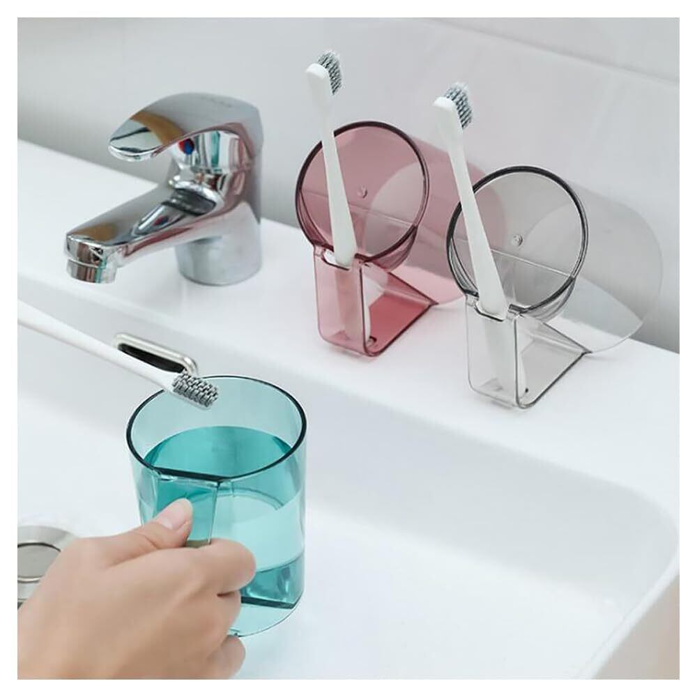 取っ手部分に歯ブラシを立てることができる歯みがきコップです。コップを下に向けて置くことができ、水が切れます,歯ブラシを立てて収納できる歯みがきコップ。水切れができ衛生的。