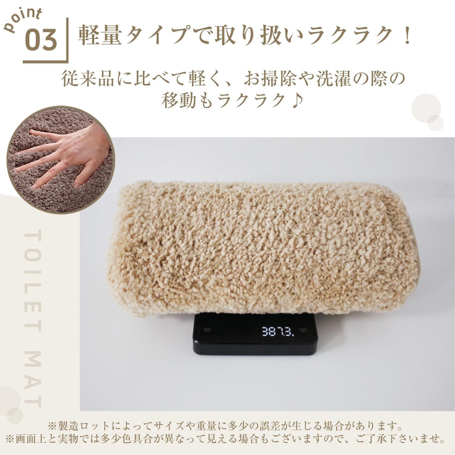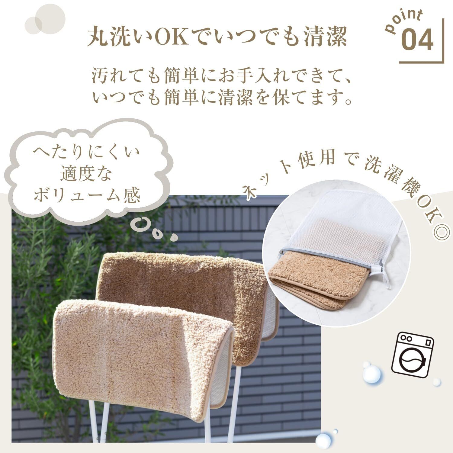 【洗濯機で丸洗い可能、毛が落ちにくい仕様】 トイレマットが洗える設計で、お手入れが簡単。繊維が抜けにくく、清潔な状態を長く保てます。また、拭ける トイレマットとしても扱いやすいため、水ハネや汚れもサッと拭き取ることができ、日々のお掃除もスムーズに行えます。