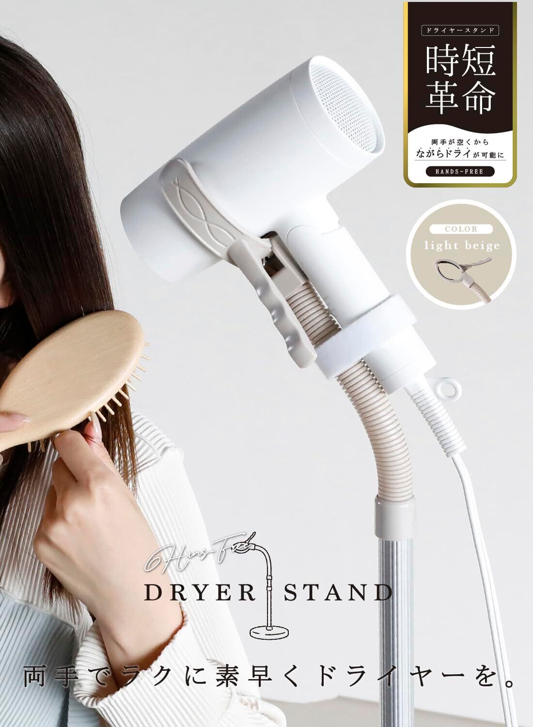両手が空くから”ながらドライ”ができる。ブラシやタオルが使えてドライヤー時間が快適になる。「ハンズフリードライヤースタンド」