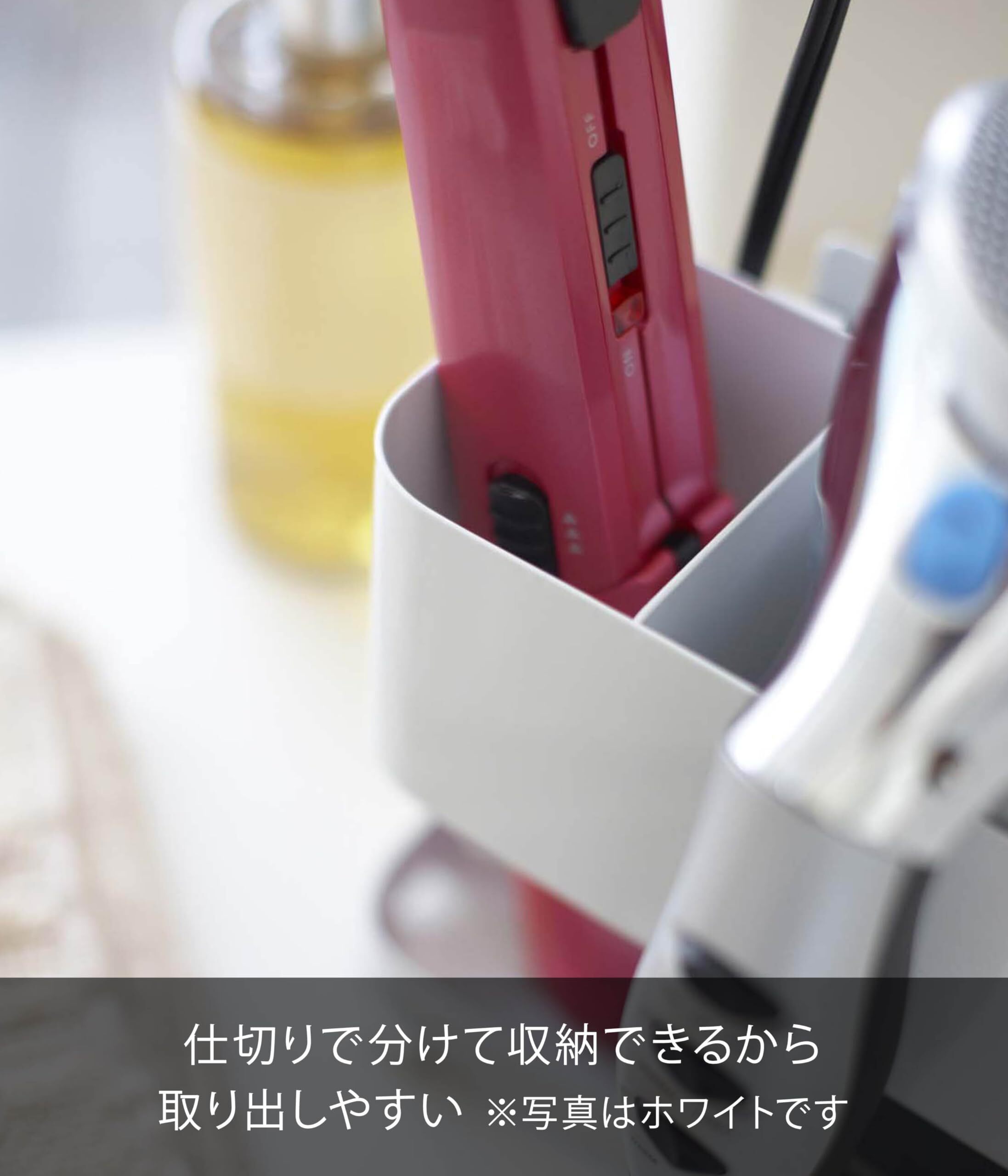洗面台の周辺が、ヘアアイロンやドライヤーが散乱。ワックスやヘアオイルも散らかって、急なお客さまが来られた際には大変!なんてことになってませんか?ごちゃごちゃしがちな洗面台まわりの小物類をスッキリ収納できるヘアアイロン&ドライヤー収納ホルダー。コード類も後ろのコード用フックに巻きつけて収納できます。洗面台の扉・鏡などにも取り付け可能。スペースが狭い1人暮らし用の洗面台や家族が多い洗面台など、重宝します。スチール製のラックは、水や汚れに強い粉体塗装を施しており、丈夫で錆びにくく、長くお使いいただけます。 カラーは、ホワイトとブラックの2色をご用意致しました。■サイズ:幅16×奥行8.5×高さ14cm■材質:スチール(粉体塗装)■重量:500g■原産国:Made in China■備考:耐荷重/2kg、付属品/扉用フック2個、コード用フック2個、吸盤2個、クッション4個、緩衝材1枚
