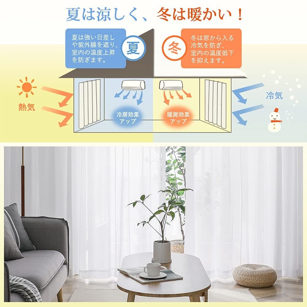 【遮熱・断熱でエアコン効率アップ】夏はジリジリとした日差しをしっかりカット、冬はお部屋の暖かさをふんわりキープ。遮熱・断熱機能で冷暖房の効きがグッと良くなり、電気代の節約にも新生活の節約アイテムとしてもぴったり。夏の暑さ対策に、今年の夏に欠かせない一枚です!