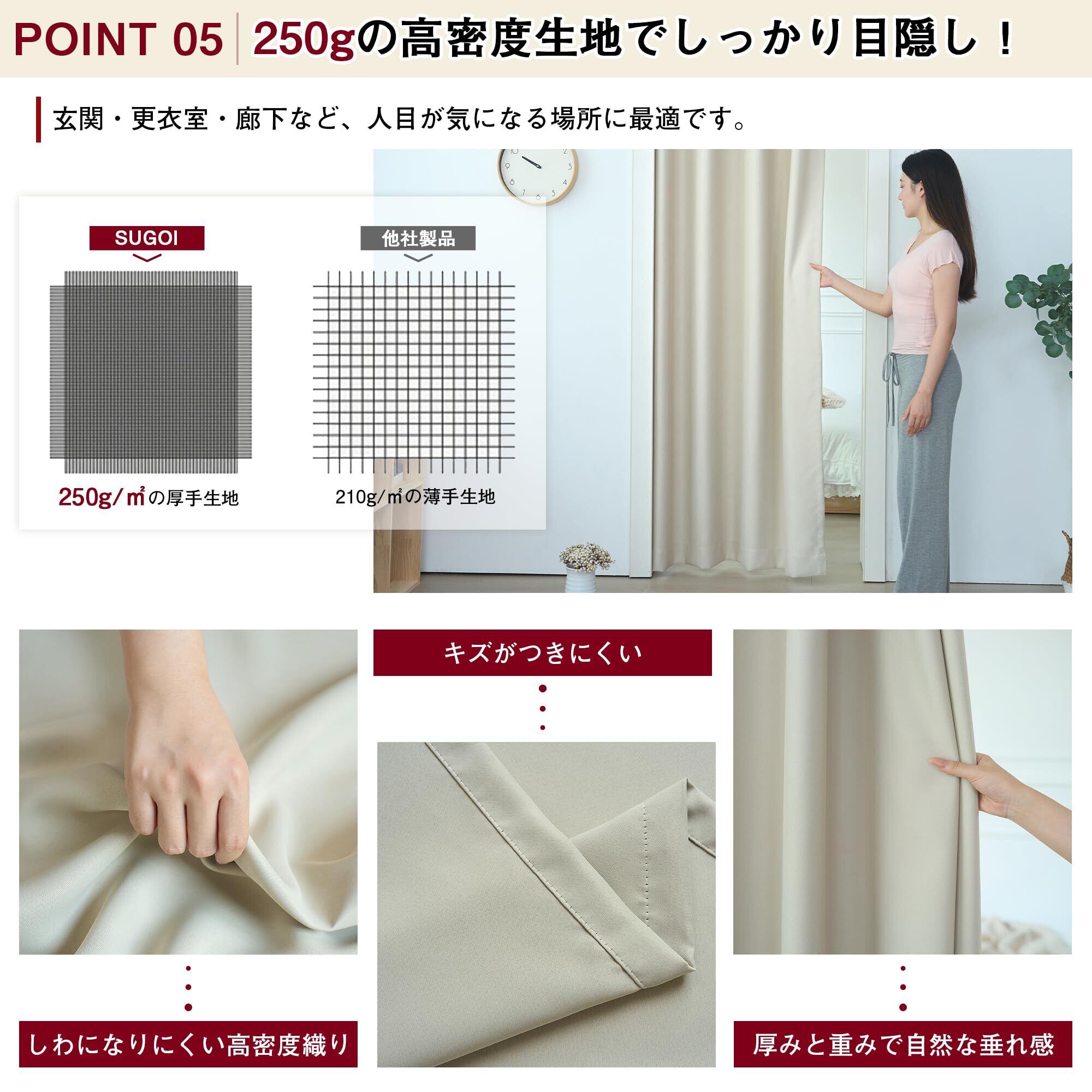 【厚手&高密度生地でしっかり目隠し&長持ち】通常品より厚みのある250g/㎡の高密度ポリエステル生地を使用し、外からの視線をしっかり遮ります。シワになりにくく、上質な垂れ感を保つので見た目も美しく、耐久性も抜群で長くご愛用いただけます。色あせしにくい素材で、お手入れも簡単。カーテン1枚で安心のプライバシー保護を実現し、遮光・防音効果とともに快適な空間をつくります。