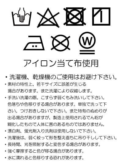 【諸注意事項:洗濯時①】・洗濯機、乾燥機のご使用はお避け下さい。また洗濯により収縮します(5~8%)。洗濯後、アイロンを掛けたり、吊った状態にするとサイズが伸縮する場合があります。・手洗い洗濯の際、こすらず弱くもみ洗いして下さい。色落ちや色移りする場合があります。単独で洗いつけ置きしないでください。