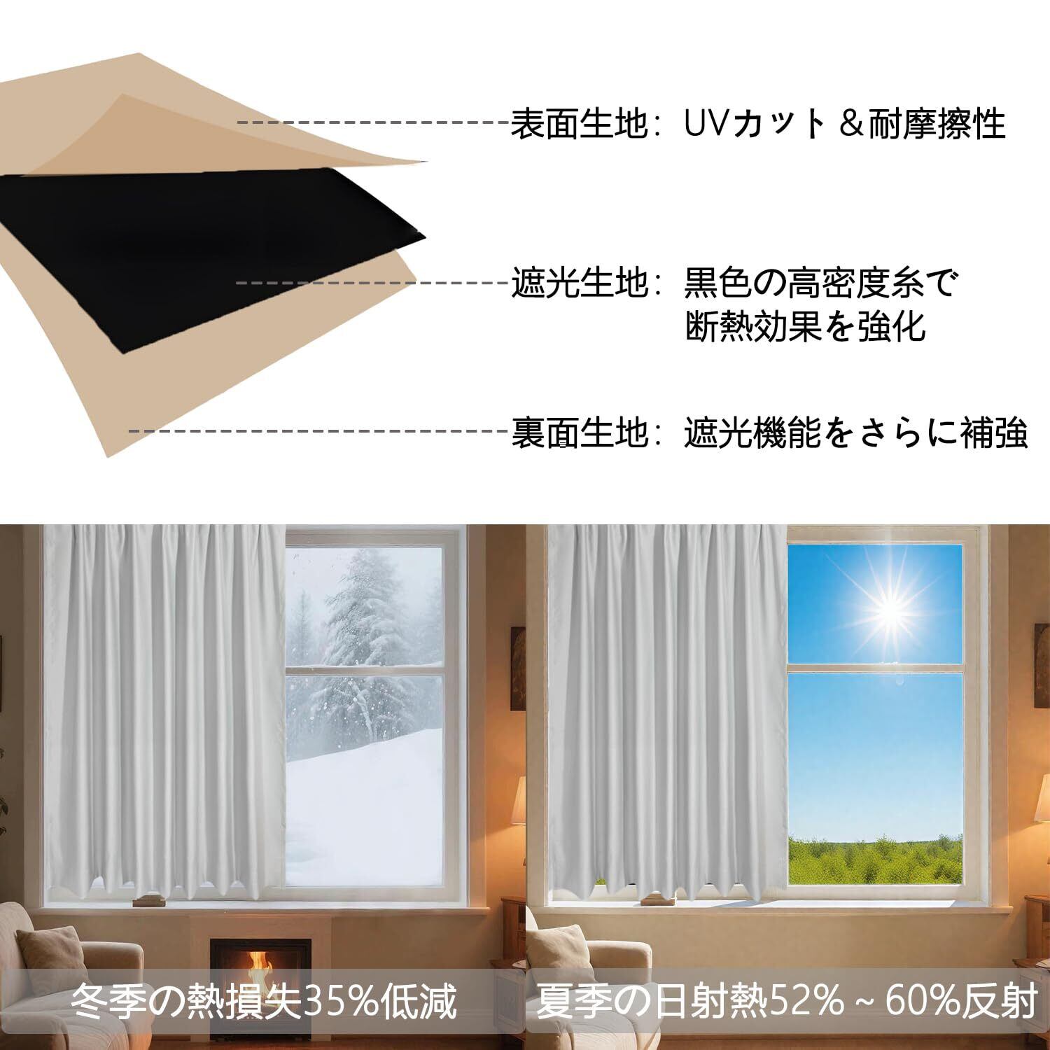 【遮熱&防寒性能】①高密度繊維構造:三重層構造の織物が緻密なバリアを形成し、太陽放射熱の52%~60%を反射可能。②UVカット機能:ポリエステル繊維自体がUPF>30の特性を有し、紫外線透過を97%遮断します。③無コーティングの特殊構造で、結露なしの快適保温。表面で冷気を遮断、遮光層のエアポケットで熱を閉じ込め、ふわふわ裏地が体感温度をアップします。