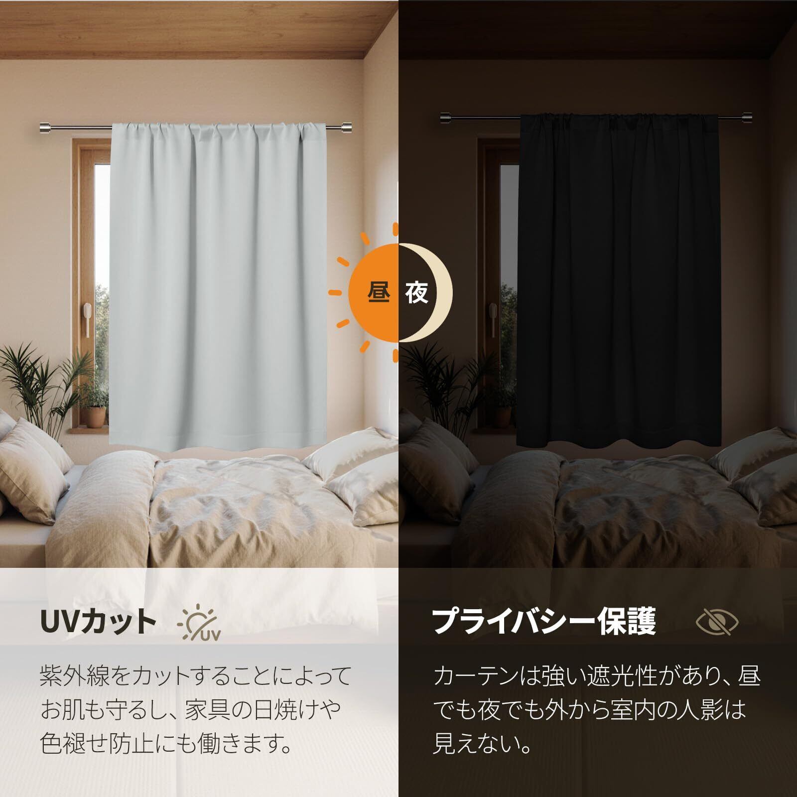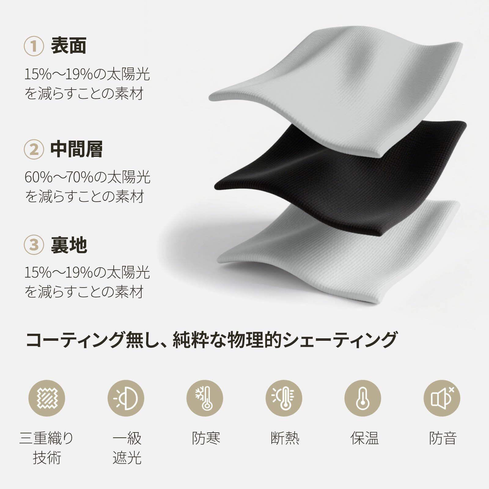 【三重織り技術&UVカット】生地は三重構造のテクノロジーの技術利用して黒い系を織り込んでいるから、優れた遮光機能が備えております。きちんと室外からの日差しや紫外線などをしっかり遮られる機能付きの厚地遮光カーテンです。紫外線をカットすることによってお肌も守るし、家具の日焼けや色褪せ防止にも働きます。そして、UVカット効果で大切なペットを紫外線から守れます。