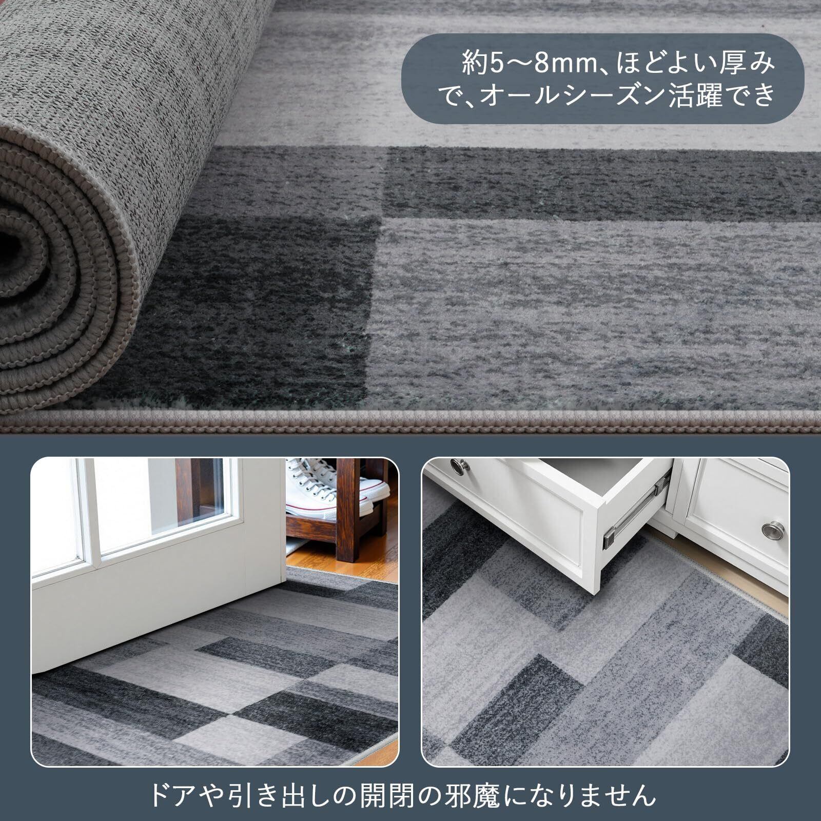 【幅広く活躍】ラグは機械織り製造で、丈夫で破れにくく、床を保護すると同時にインテリアとしても活用できま す。端縁にはオーバーロックの加工を施し、遊び毛が出たり、形を崩れたりしにくく、優れた耐久性を実現 します。また、ほどよい厚さで、オールシーズンお使いできます。ベッドサイド、リビングルーム、ベランダ、やダイニングの テーブルの下など様々なシーンで活躍します