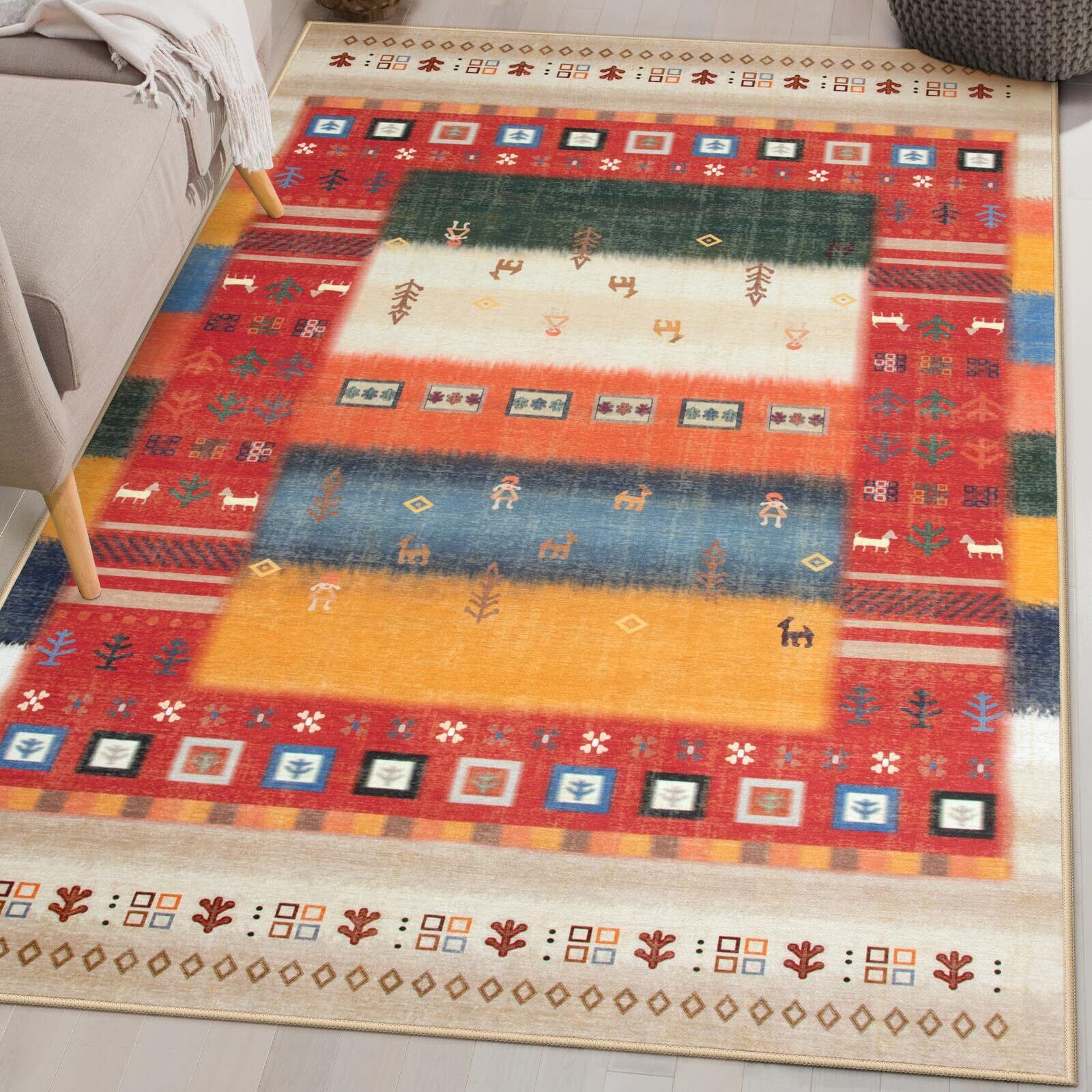 HAOCOO ラグ 90х150cm 洗える ラグマット 0.7畳 エスニック風 民族 カーペット対応 滑り止め 床保護 防音 一人暮らし シェニール ラグ オールシーズン適用 耐磨耗性 軽量 ギャベ柄 カラフル