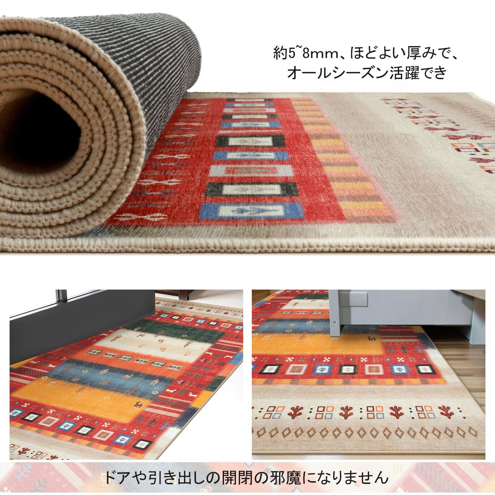 【カラフルなデザイン】さまざまなスタイルのパターンからお選びいただけます。ヴィンテージなエスニックな雰囲気と明るい色、伝統的なギャベ柄がインテリア空間に魅力を加えます。先端の印刷技術より駆使され、平織り生地に繊細な画像がプリントされ、ラグの上品さ を演出します。端縁にはオーバーロックの加工を施し、遊び毛が出たり、形を崩れたりしにくく、優れた耐久性を実現 します。更に、角は細いパイピングで、軽やかな印象に仕上げています。