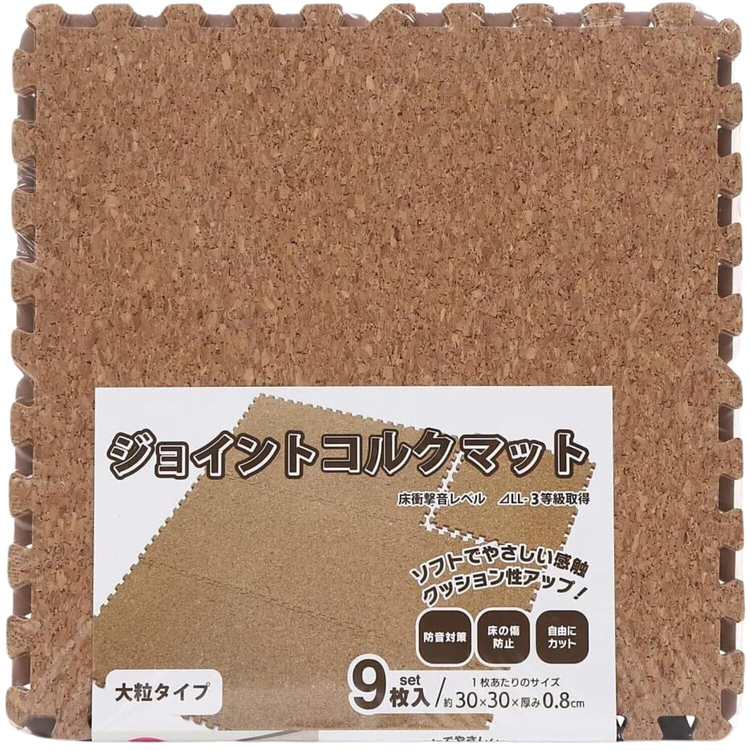 ・【サイズ】1枚あたりの外寸(約):幅30cm×奥行30cm×厚み0.8cm(1枚) 【セット内容】ジョイントマット9枚set 、総重量:約 550g 【素材】表面/コルク、裏面/ポリエチレン