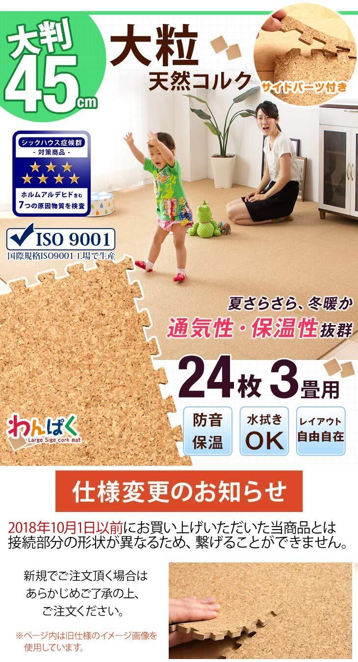 ※2014年6月、大判タイプにリニューアルし、2018年10月にジョイント部分を仕様変更しました。2018年10月1日以前にお買い上げいただいた当商品とは、接続部分の形状が異なるためジョイントさせることができません。お買い求めの際は十分ご注意ください。 ※配送は全て宅配便(1人)での玄関渡しとなります。 ※コルクは天然素材のため性質上粉が生じたり欠けたりする場合がございます。その場合、 掃除機で吸い取るなどのお手入れが必要となりますので、予めご了承ください。 ※マットの上での暖房器具の使用はおやめください。 ※汚れた場合は固く絞った雑巾で拭き取ってください。水分が隙間に入り込んだ場合はカビ発生の原因となる場合がありますので、定期的にマットを剥がして掃除してください。匂いが気になる場合は、風通しの良いところで干してください。