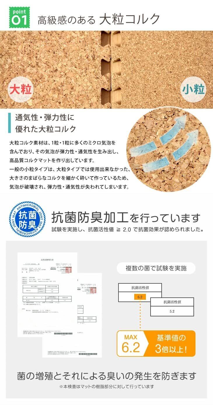 【おすすめポイント!】 ・お子さまにも安心のノンホルムアルデヒド ・シックハウス症候群の原因物質7種をしっかり検査 ・届いてすぐに使える、サイドパーツ付き! ・設置時間も短縮できる大判45cm ・高品質の大粒コルク使用・お子さまにも安心の低ホルムアルデヒド ・クッション性が高く、床へのキズ ・衝撃防止に・階下への防音対策 ・床の冷たさを防ぐ保温性 ・カッターやはさみで簡単に切れるのでレイアウト自由自在 ・汚れた時はさっと一拭きお手入れ簡単 ・夏はさらさら、冬は暖かでオールシーズン使えます ・敷きっぱなしでも清潔キープ 抗菌防臭加工樹脂