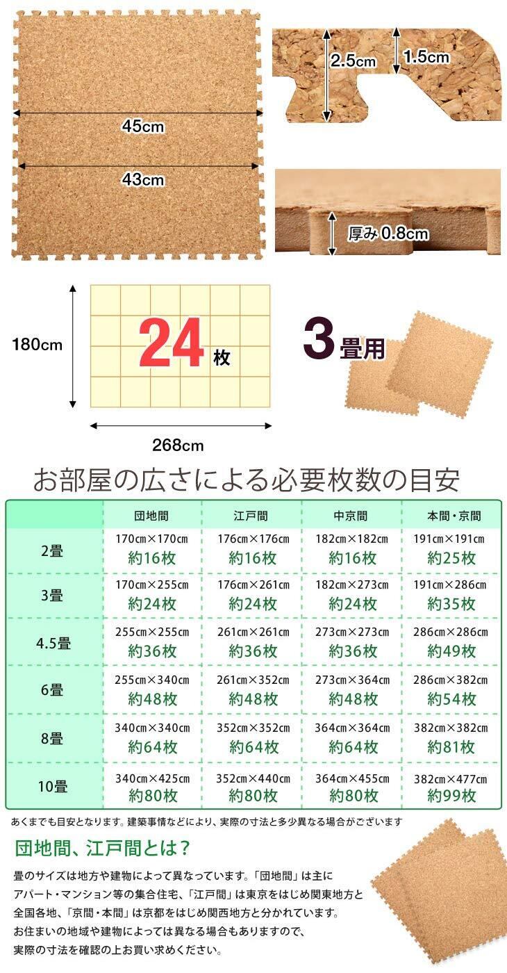 【サイズ】縦4列×横6列で敷いた場合 180×268cm(3畳) / 幅45×奥行45×厚み0.8cm(1枚)【セット内容】コルクマット24枚 / サイドパーツ(角付きパーツ24本 、角なしパーツ24本) 【重量】約3.8kg