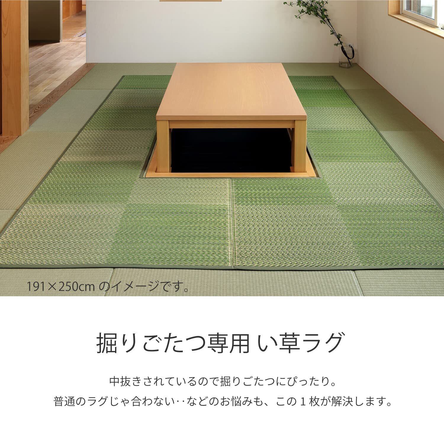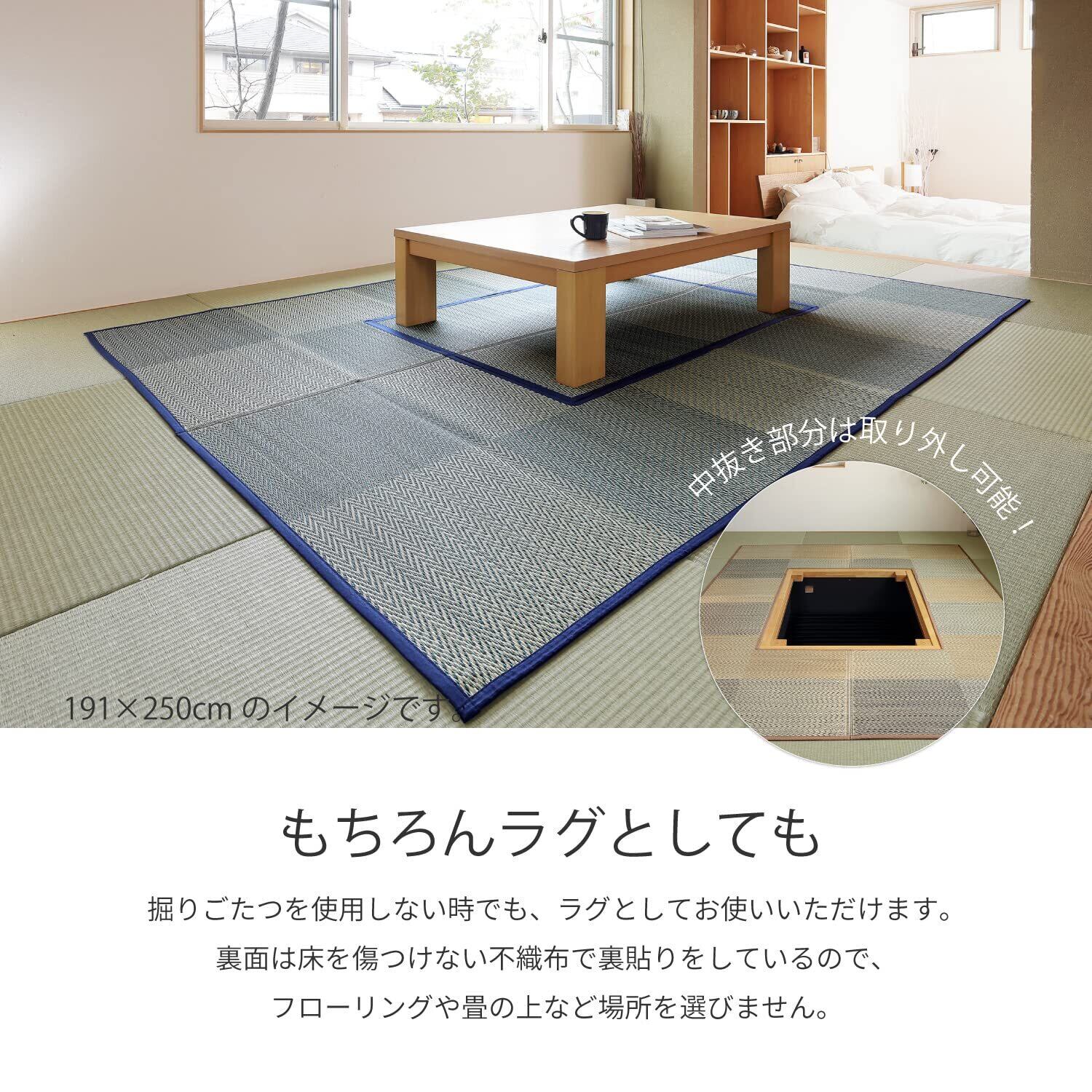 掘りごたつ対応のい草ラグです。中抜きされているので、掘りごたつにあわせてご使用いただけます。ラグの中央部分を付けて通常のラグとしてもお使いいただけます。