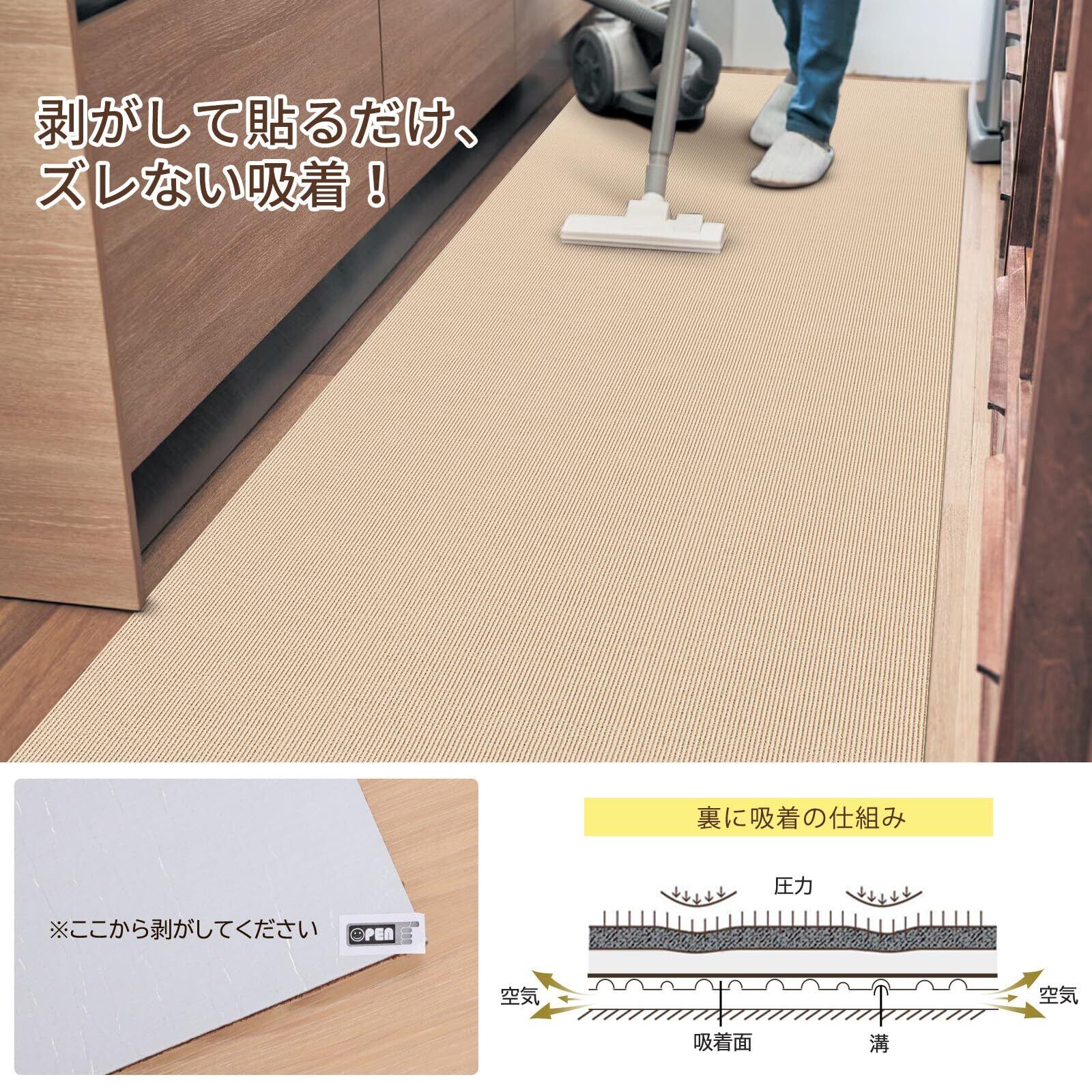 「敷くだけでズレない吸着」ロール梱包でお届け、開封後すぐに使え、面倒な手間を省くだけで時短に!裏面は特殊吸着加工、保護フィルムを剥がして貼るだけで床面に密着してずれにくい。簡単に外せて、何度でも繰り返し敷き直して経済的。