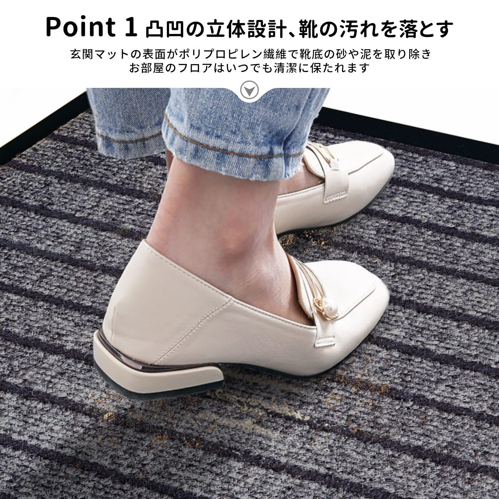 【泥落とし&吸水】屋内、屋外でお使いいただける泥落としマットです。玄関マットの表面がポリプロピレン繊維で靴底の砂や泥を取り除き、お部屋のフロアはいつでも清潔に保たれます。雨傘やレインコートから滴る水を瞬時に吸収、優れた吸水機能で、雨天や積雪時の玄関のお悩みを解決します。一年中も快適にご使用いただけます。