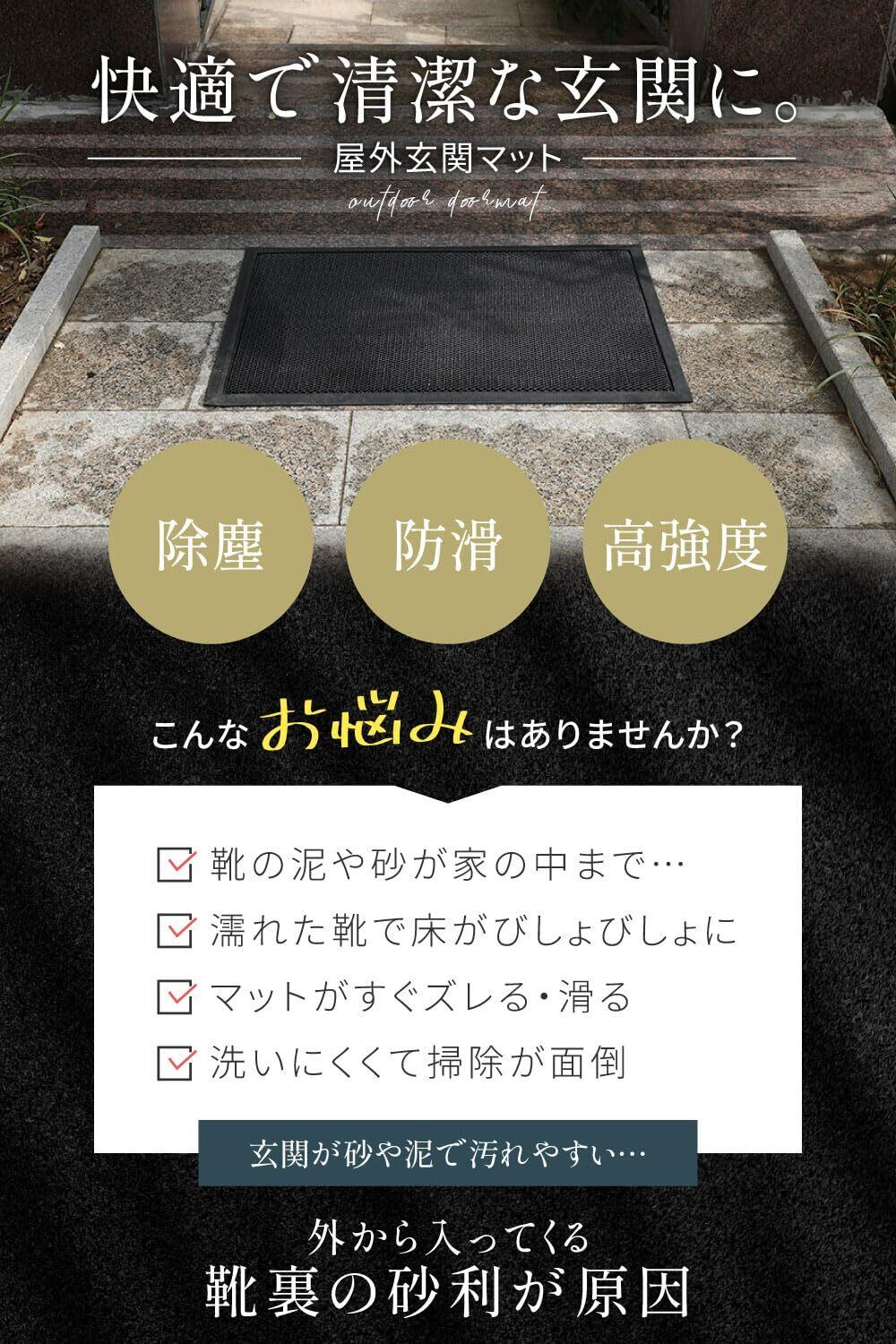 【細かい泥や砂もキャッチする凹凸構造】 この屋外用玄関マットは、表面に細かい凹凸のパターンを採用しており、靴底に付着した泥や砂などをしっかりと取り除きます。玄関先で靴を軽くこするだけでOK。特に玄関外や勝手口、店舗入り口など、人の出入りが多い場所におすすめな屋外マットです。