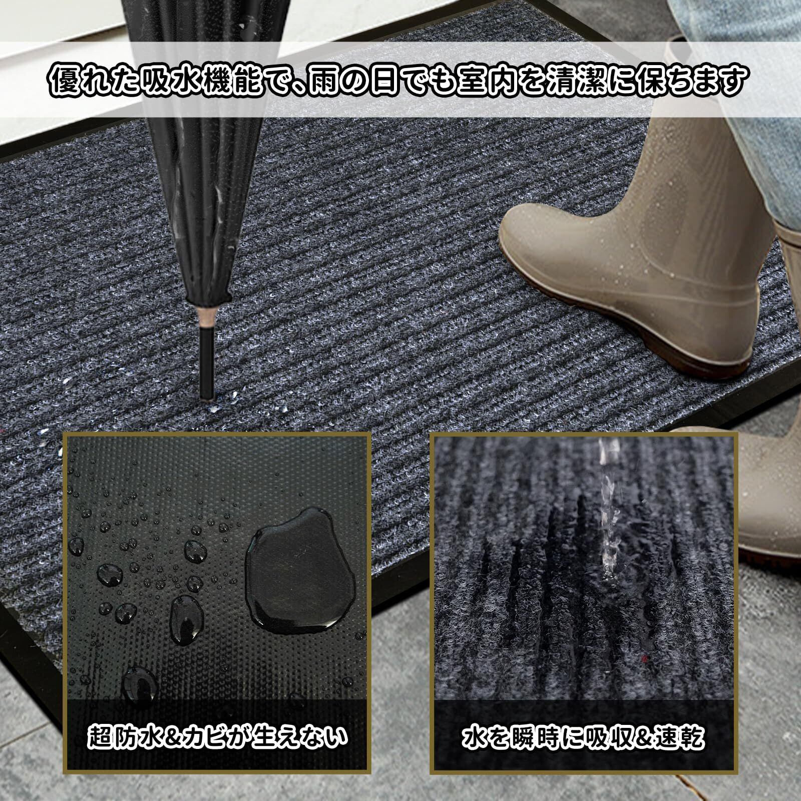 【泥落とし&吸水】屋内、屋外で泥落としマットとして使って、玄関マットの上で数回こするだけで、靴に付着した泥砂やホコリ、雨水などの侵入を効率よく防ぎ、屋内を清潔に保ちます。雨傘やレインコートから滴る水を瞬時に吸収、優れた吸水機能で、雨の日でも室内を清潔に保ちます。
