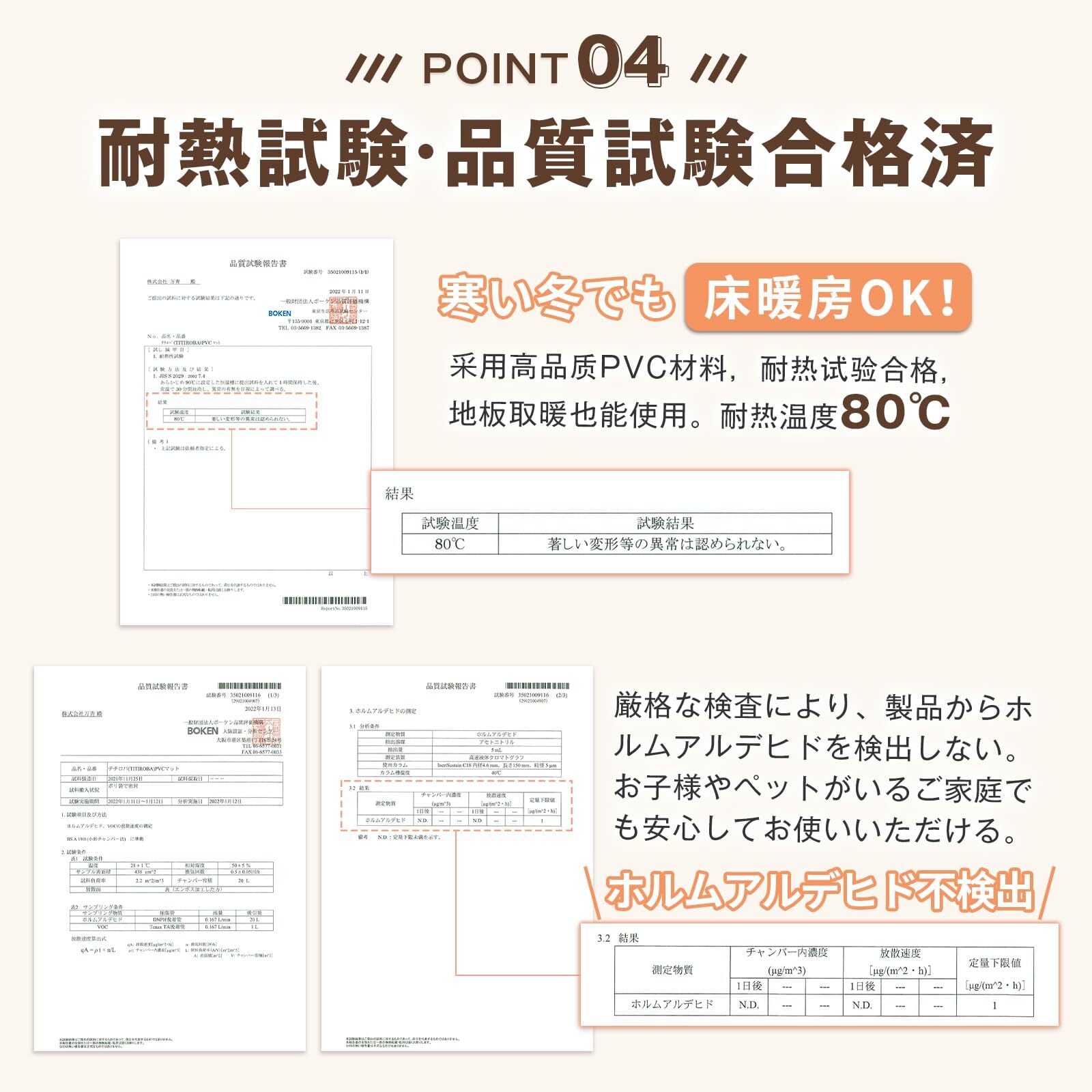 【床暖房に対応可能・丈夫で長持ち】80℃までの耐熱素材により、床暖房でも利用可能。無毒無味、人体にやさしい素材を採用し、PVC特有の化学臭いが薄くなり、子どもや老人が安心にご利用いただける。