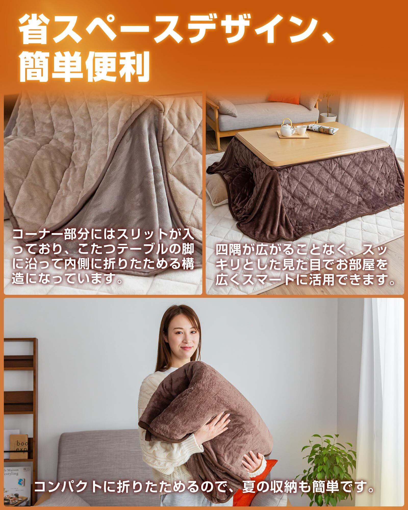 【省スペース・見た目スッキリ!】コーナー部分にはスリットが入っていて、こたつ台の足に沿うように中に折りたためる構造になっているので四隅が広がらず、すっきりした見た目、お部屋を広くスマートに使えます。