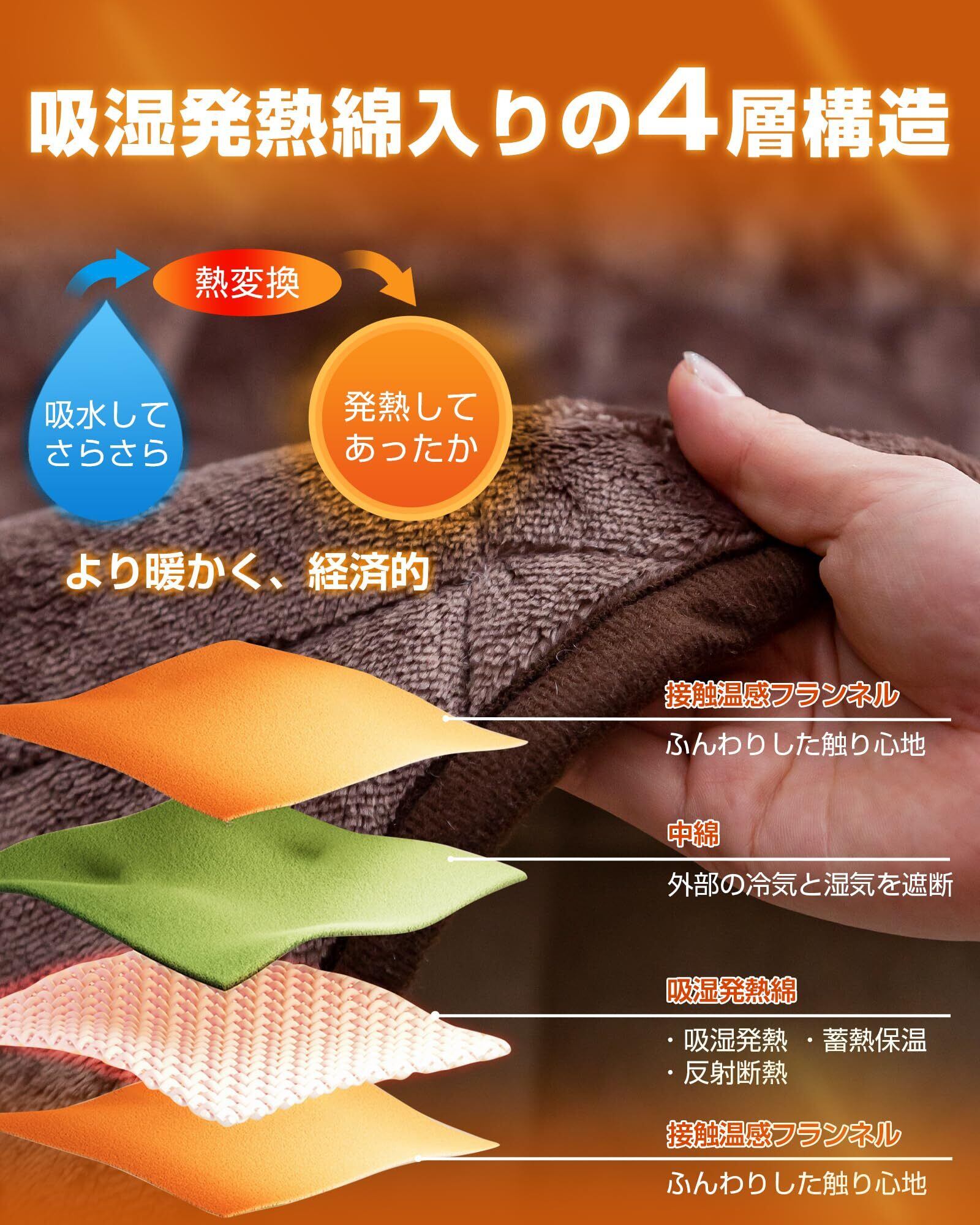 【吸湿発熱 ・さらに暖かい!】中綿には湿気を吸収して熱に変換する「発熱綿」を使用し、汗などの水分を吸収して発熱できる繊維を加工済みで、寝ている間の湿気を温もりに変えます。