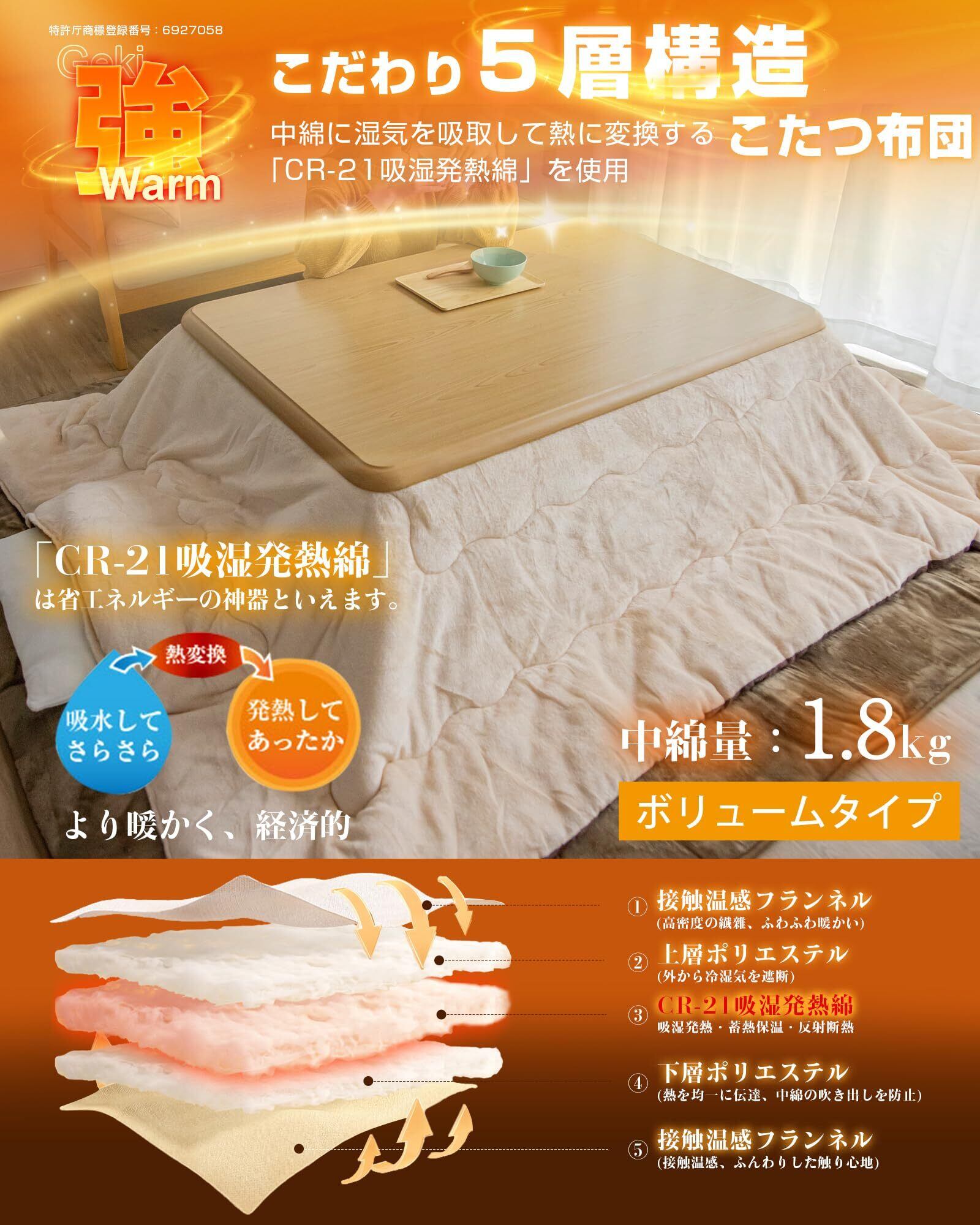 【日本企業開発・ぽかぽか5層構造】毎年大人気のこたつ布団が、日本の会社企画により今年は5層に改良して再登場します。①表地「接触温感」「静電気防止」フランネル ②「冷気遮断」ポリエステル綿 ③湿気を吸収して熱に変換する「CR-21吸湿発熱綿」④熱を均一に伝達するポリエステル綿⑤触れると温かみのある超極細マイクロファイバー。5層のそれぞれの機能を重ね合わせることで持続的な保温効果を実現しています。