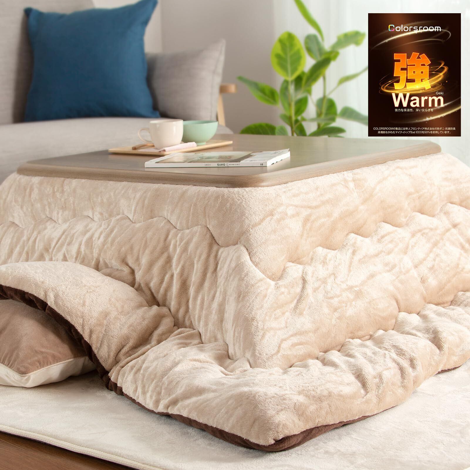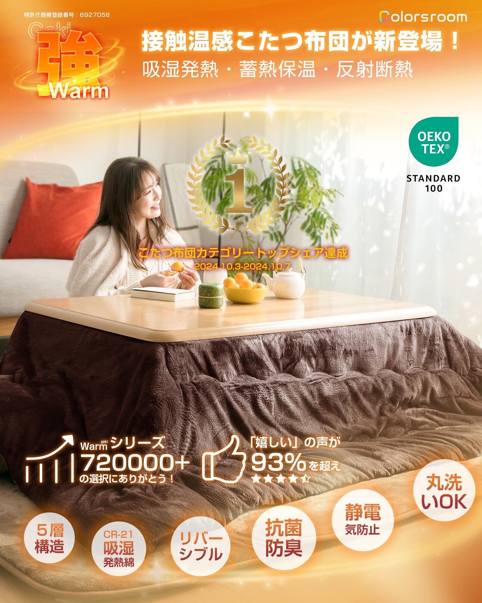 【超発熱性・抗菌防臭・消臭効果・高調湿性】Colorsroomこたつ布団は『CR-21吸湿発熱綿』を使用して、湿気を吸取して熱に変換する、寒い時には熱を放出します。こたつ内の温度を一定に調整しようとする働きをします。中綿には抗菌防臭加工を施しています。暖かいところで繁殖しやすい、菌の発生を抑制し、嫌なニオイを防ぐ高性能な中綿になっています。いつでも清潔に、お子様、お年寄りにもご使用いただきます。