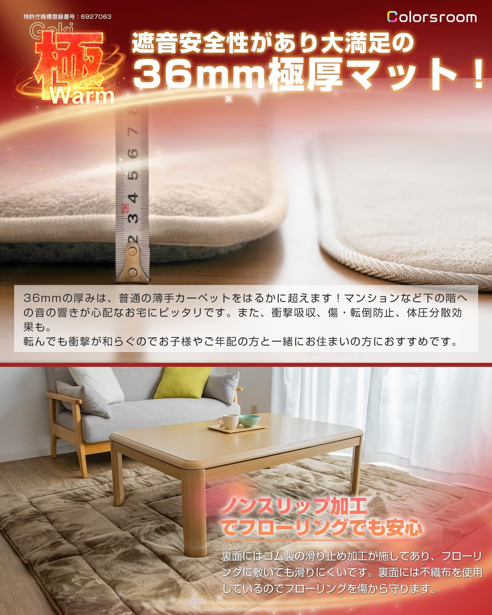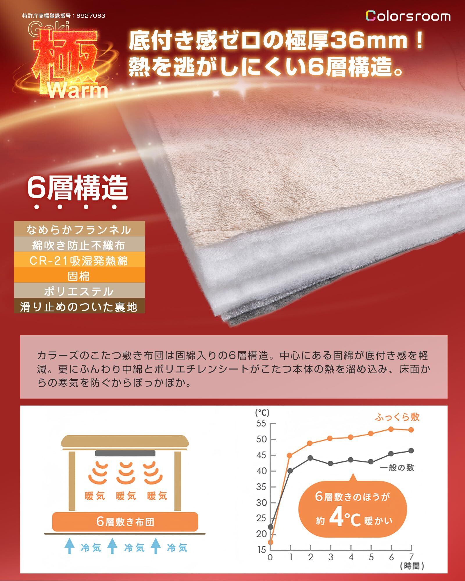 【6層構造・極厚36mm一般的なラグの厚みの5倍】①表地「接触温感」「静電気防止」フランネル ②「中の綿が出にくい」不織布 ③湿気を吸収して熱に変換する「CR-21吸湿発熱綿」④熱を逃がしにくい固綿⑤熱を均一に伝達するポリエステル綿⑥ノンスリップ加工。6層のそれぞれの機能を重ね合わせることでこたつ本体の熱をため込み、床面からの冷気を防ぎます。