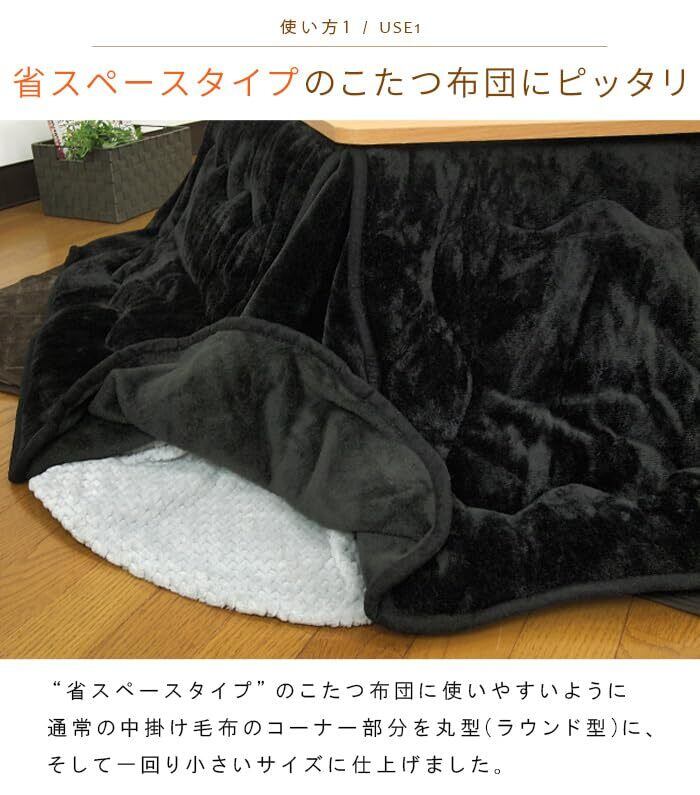 ふんわり暖かなフランネルのこたつ中掛け毛布。省スペースタイプのこたつ布団に使いやすいよう、ひと回り小さいサイズに、コーナー部分を丸型に仕上げました。