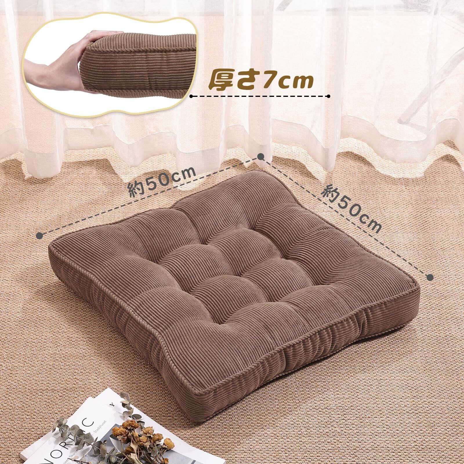 Baibu Home 座布団 コーデュロイ生地 厚め クッション 床用 大きめ 50cm角 厚い 座り心地いい 体圧分散 座布団 無地 シートクッション ブラウン ソファ クッション