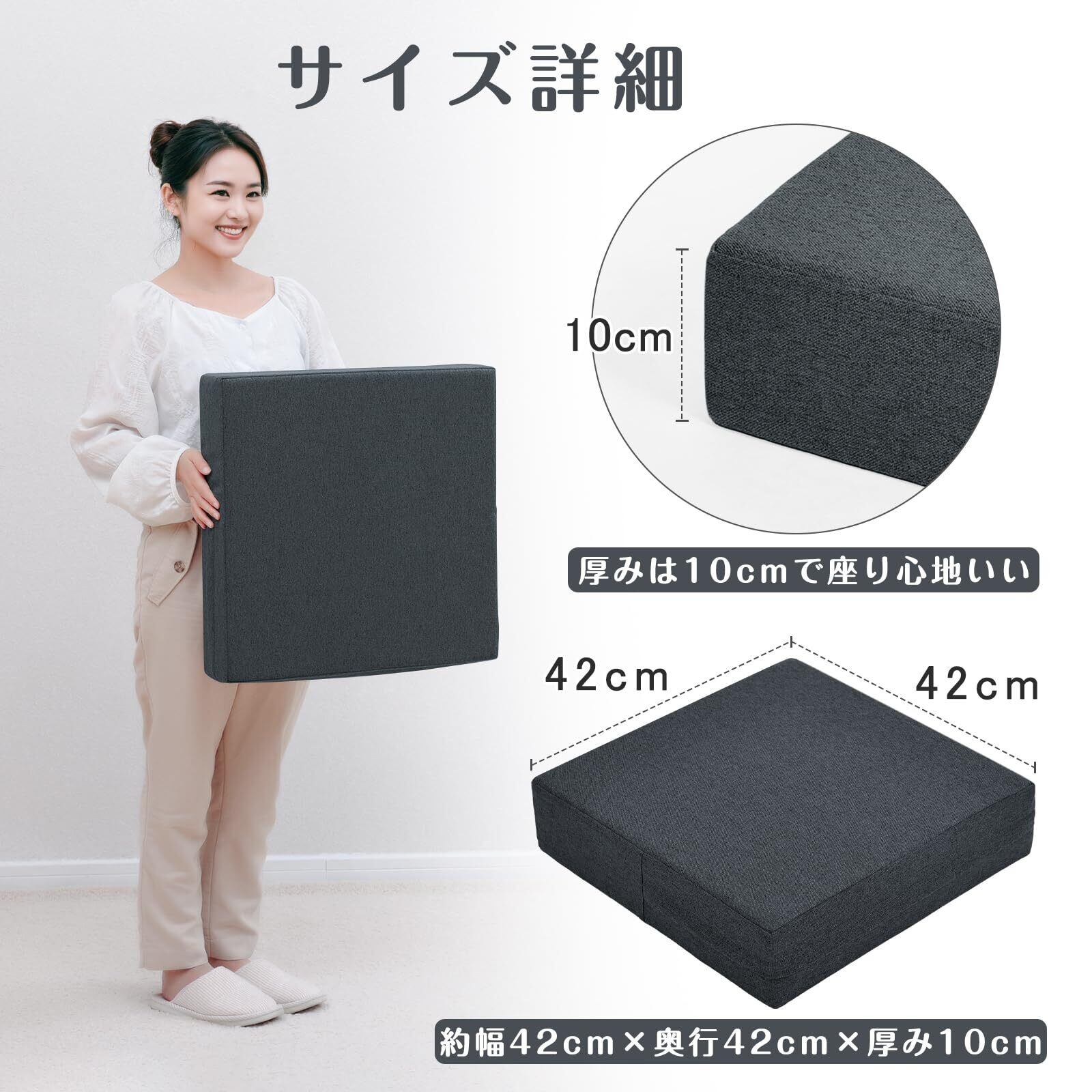 【サイズ】:約幅42cm×奥行42cm×厚み10cm 本体重量:0.82kg 生地:100%ポリエステル 中身:3CMの低反発ウレタン+7cmの高反発ウレタンの2層構造